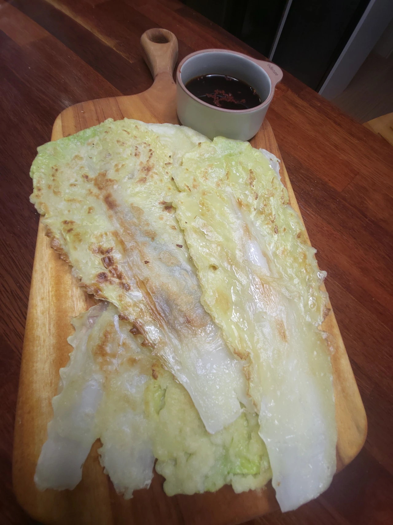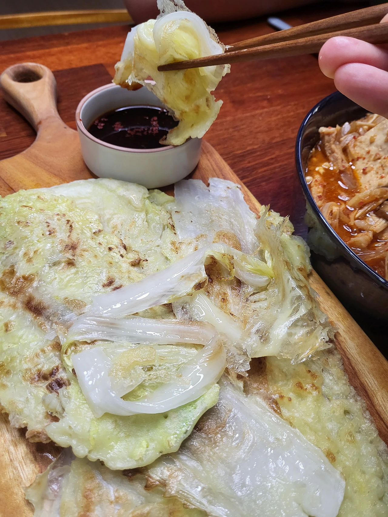 처음 보는 사람에게 이 음식은 아마 초라해 보일지도 모른다. 파전이나 김치전처럼 해물이나 고기가 올라가지도 않고, 여러 가지를 섞지도 않는다. 필요한 재료는 딱 4가지. 배추, 물, 밀가루, 기름이 전부이다. 하지만 아는 맛이 제일 무섭다. 우리는 이맛을 알고 있다. 기름과 밀가루의 맛, 거기에 배추의 달달함과 아삭함을 더한 맛이다. 레시피도 계란프라이만큼이나 간단하다. 밀가루와 물을 섞어 반죽을 만들고 배춧잎을 한 장씩 떼어내어 반죽물에 담가 기름에 부쳐내면 끝이다. 나는 배추 줄기 쪽을 손으로 뚝뚝 부러 뜨려 굴국진 배추줄기를 평평하게 펴준다. 인터넷 레시피를 보니 칼로 두들기거나 칼집을 내거나, 뜨거운 물에 데치는 사람들도 있는데, 나는 성질이 급해서 그냥 손으로 마구 분지른다. 밀가루와 물의 농도에 따라 약간의 바삭함과 쫀득함이 달라질 수 있다. 나는 약간 묽게 하여 바삭한 식감을 느낄 수 있는 것이 더 좋은 것 같다. 가위로 깔끔하게 잘라서 먹는 사람도 봤지만, 배추 전은 손으로 찢어서 돌돌 말아먹어야 배추줄기부터 이파리까지 한꺼번에 입에 넣을 수 있다.
