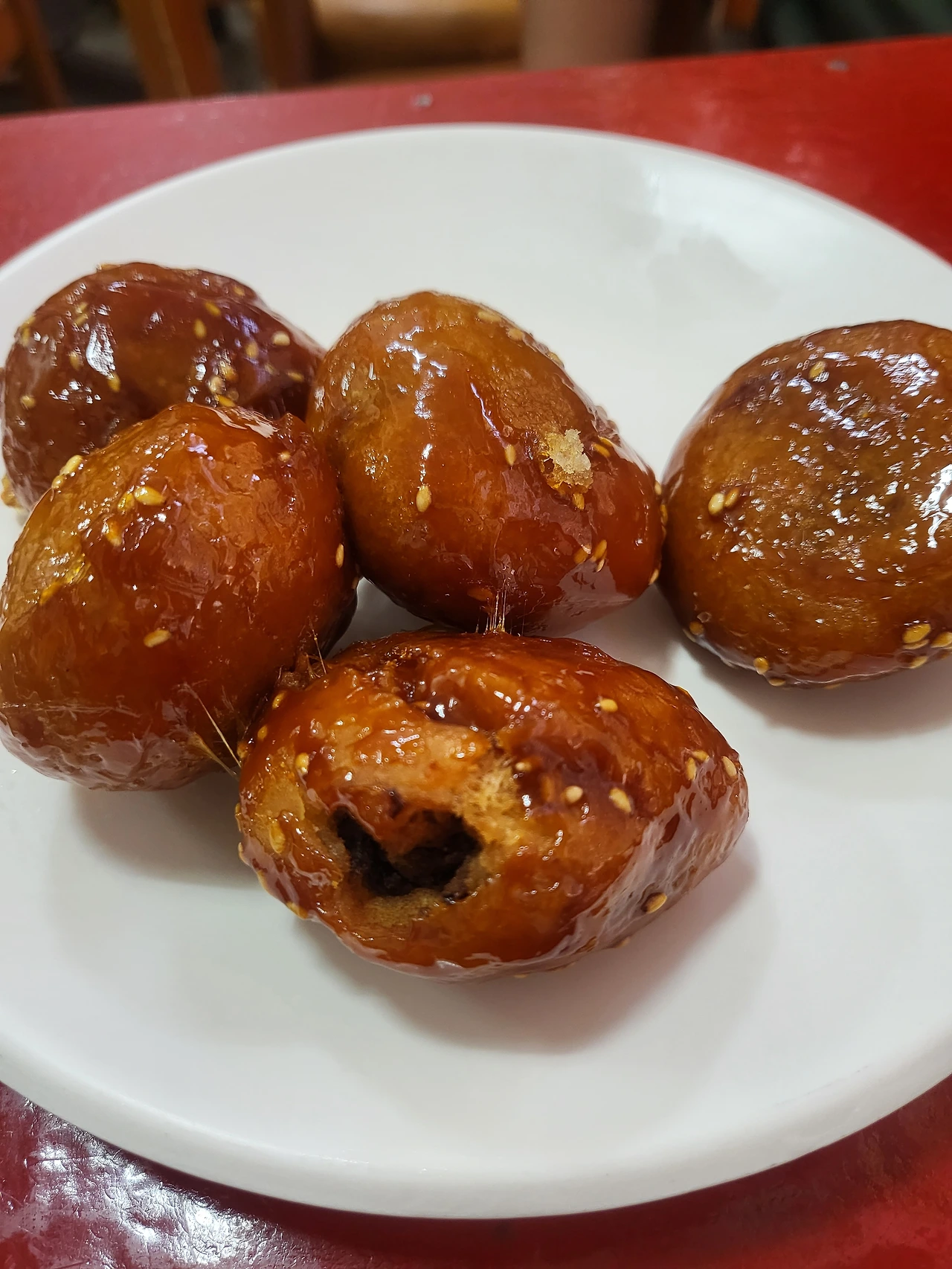 왼: 진주 꿀빵. 그날은 금방나온 따끈따끈한 꿀빵을 먹을 수 있었다. 띠뜻해도 탕후루처럼 바삭하다. 오:포크로 잘라 찐빵의 단면적을 넓혀 최대한 골고루 팥죽을 빵에 스며들게 한다