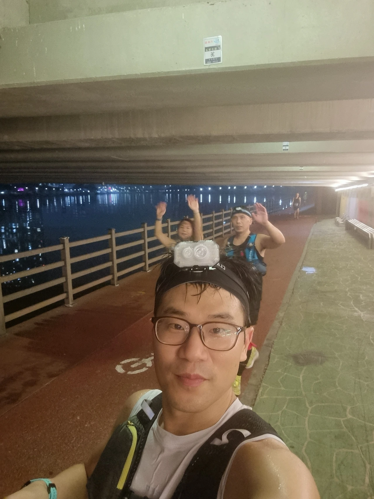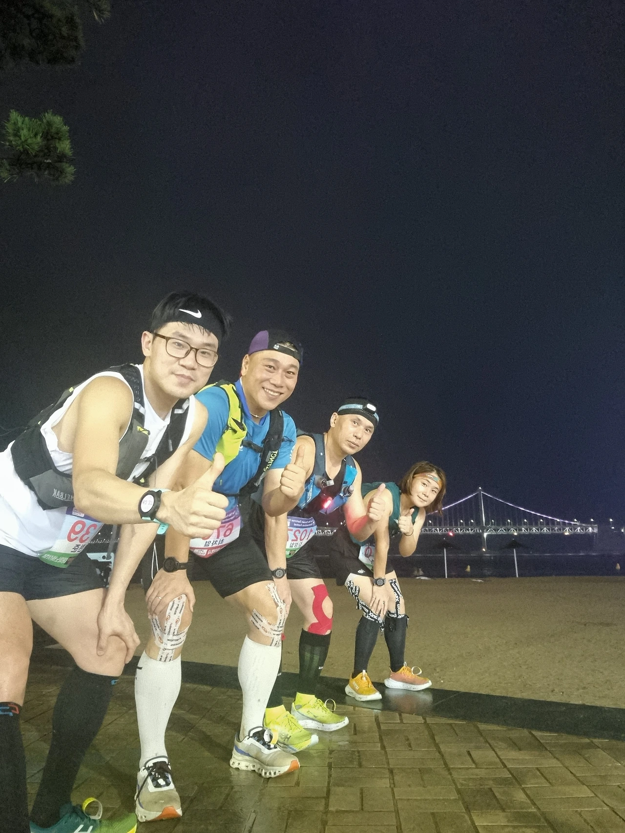 뛰다가 걷다가 중간에 다리도 한번씩 풀어주기도 했다. 몸은 땀에 절어 있었고, 힘들었지만 아직까지는 뛸만했다. 아직까지 버틸만 하다는 소리는 점점 더 완주할 가능성이 높다는 느낌이었다. 우리는 원래 출발지이자 결승점인수영만요트경기장 CP를 향해서 뛰고 있었다. 가는 길 보다 돌아오는 길은 더 가깝게 느껴진다. 요트경기장이 보이자 더 발걸음이 경쾌해졌다. CP를 만나면 너무나 반갑다. 내가 몇초후에는 달리던 걸음을 멈추고 잠깐이라도 쉴 수 있다는 말이다. 우리 앞에 뛰어가던 사람들도 속도를 높였다. 50K인 사람들이 결승점에 도착하면서 사진을 찍고 있었다. 내 기억으로는 65Km를 달린지점이었다. 시간은 새벽 3시가 넘은 시간이었다. 50K를 달리고 쉬고 있는 사람들이 크게 부럽지는 않았다. 나는 더 먼 거리를 달려왔고, 이제 35K만 더 달리면 된다. 풀코스도 안남은 거리였다. 이제 35K LSD한번만 하면 된다고 생각하면 되는 것이었다.