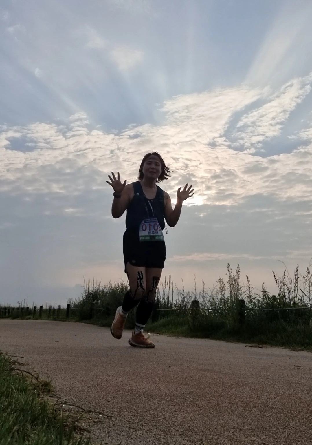 나는 그쯤 되면 내가 너덜너덜 해져서 "난 한걸음도 이제 더 이상 못 걷겠어!"라고 외치거나 너무 힘이 들어서 울면서 뛰어갈 것이라고 예상했는데, 정말 못 달릴 것 같았는데, 달린다고 발을 땅에서 떼니 가볍게 다리가 올라가고, 달려지는 것이 신기했다. 그것도 새벽바람에 기분이 좋았다. 뛸수록 더 발이 살짝살짝 가벼워지는 기분이 들었다. 나는 달리며 말했다. "나는 여자 장변인 것을 인정해야 되나 봐요." 그때까지는 너무 신나게 달렸다. 지금의 기억으로는 70~80km 지점이었던 그때가 가장 행복했던 것 같다. 그런 행복감과 함께 해돋이는 보이지 않았지만 새벽이 밝아오고 점점 더 환해지고 있었다. 아침이 밝아오고 있었다. 이제 이 아침만 잘 버티면 나는 100Km를 완주해 있으리라...