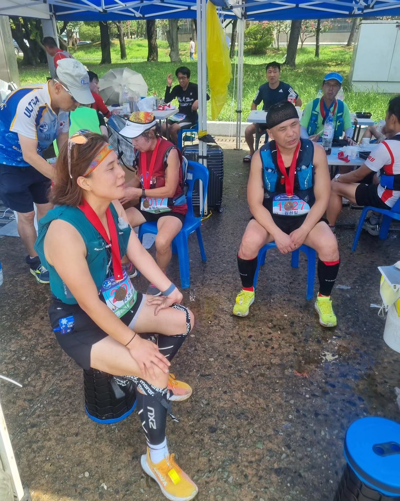 나는 일단 사람들이 밥을 먹고 있는 천막 쪽을 걸어갔다. 그늘이 너무 가고 싶었다. 그렇지만 어떻게 할지를 몰랐다. 앉지도 못하고, 서있지도 못하고 어쩔 줄을 몰라했다. 아마 뇌가 정지되었다. 달리는데 모든 에너지를 빼앗기고 뭘 해야 할지 모르는 사람처럼 우왕좌왕하고 있었다. 100K를 다 뛰었다는 기쁨과 해냈다는 성취감을 만끽할 수도 없을 만큼 몸이 지쳐 있었다. 자원봉사자분이 콜라를 주셨다. 나는 원래 콜라를 잘 안 마신다. 특히 펩시 콜라는 안 마신다. 그런데 자원봉사자분이 주신 펩시콜라를 연속해서 7잔을 들이켰다. 그렇게 마셔도 배도 안 부르고 트림도 안 났다. 계속해서 들어갔다. 내가 겨우 자리를 잡고 앉아서 있는데, 제일 멀쩡한 준옹이님이 핸드폰으로 월계관 사진을 한번 더 찍자면서 피니쉬 라인 쪽으로 갔다. 아직까지 준옹이님은 힘이 남아 있었던 것이었다. 진정한 장변이다. 나는 그쪽을 쳐다볼 기력도 없었다. 옆에 아촌님도 앉아 있었는데, 아무 말이 없었다. 나는 아촌님이 제일 앞에서 묵묵히 큰 형님처럼 아무 말도 없이 잘 뛰어서 체력이 남아 있는 줄 알았는데 아촌님도 말할 힘도 남아 있지 않아서 아무 말 없이 달리기만 했던 것이었다. 아촌님도 죽을 만큼 힘들었다는 것을 느끼자 동병상련을 느꼈다. 사진 찍자는 준옹이 님의 제안을 둘 다 무시했다. 준옹이님이 절어 있는 우리 둘의 모습을 찍어주었다. 사진에 예쁘게 나오고, 멋지게 나오는 것이 안중에 없었다. 표정관리가 안되었다.