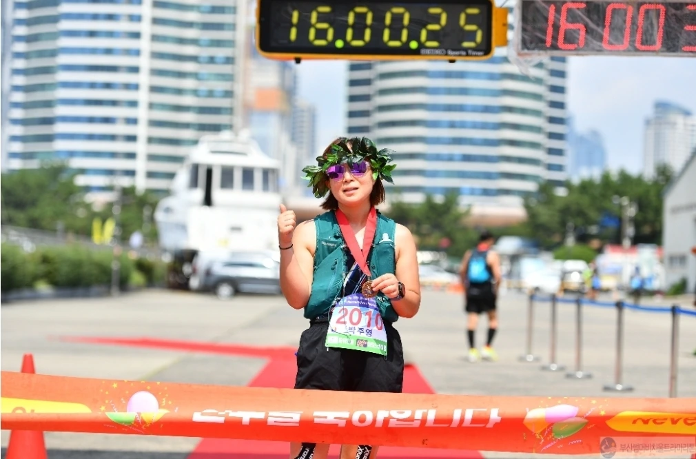 가까스로 문텐로드를 지나왔다. 문텐로드는 상황이 좋아졌다고 하더라도 가까스로, 겨우라는 수식어가 붙어야 한다. 문텐로드를 올라오자마자 준옹이님과 아촌님이 뛰었다. 그때부터는 내리막길이라서 사실 뛸 만했다. 약간의 그늘도 있어서 뛰어졌다. 하지만 내리막길이 금방 끝나고 해운대 백사장이 펼쳐졌다. 아촌님이 제일 앞에서 뛰고 준옹이님이 중간에서 뛰고, 내가 제일 뒤에서 뛰었다. 서로 20미터 정도 떨어져서 뛰고 있었다. 사실 너무 뜨거워서 뛰는 게 더 나을 수도 있겠다고 생각했다. 뛰는 것이나 걷는 것 둘 다 힘들었고 일초라도 빨리 이 불지옥을 벗어나야 한다고 생각했다. 30도가 넘는 날씨에 해수욕장 백사장을 보니 파라솔에는 손님이라고는 없었고, 바닷물에도 사람들은 없었다. 너무 뜨거운 날씨라 놀고 있는 사람도 거의 없었다. 센텐을 좋아하는 외국인 할아버지 한 명만이 웃통을 벗고 햇볕을 쬐고 있었다. 달리는 게 힘들다기보다는 너무 뜨거워서 토할 것 같고 힘들었다. 물을 마시고, 포도당 사탕을 먹었는데도 너무 힘들었다. 내가 반정도 뛰다가 도저히 못 뛰고 걸으니 나와 점점 격차를 벌어지고 있던 우리 일행이 다 같이 걸었다. 진짜 내가 스무 살만 되었어도 주저앉아서 '으앙' 하고 소리 내어 울었을 것이다. 마흔 살인 나는 힘들다고 우는 나잇값을 할 수 없었다. 그런데 이러다가 죽을 수도 있겠다는 공포감이 들었다. '내가 죽으면 우리 채채는 어떻게 하나.'라는 생각이 찰나로 스쳤다. 그래도 잘 살아가겠지만 '아, 난 여기서 죽을 수는 없어.'라고 생각하며 그때부터 뭘 계속 먹었던 것 같다. 물도 먹고 포도당 사탕도 계속 먹었다.