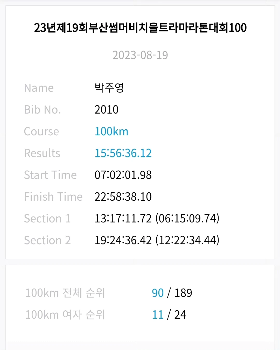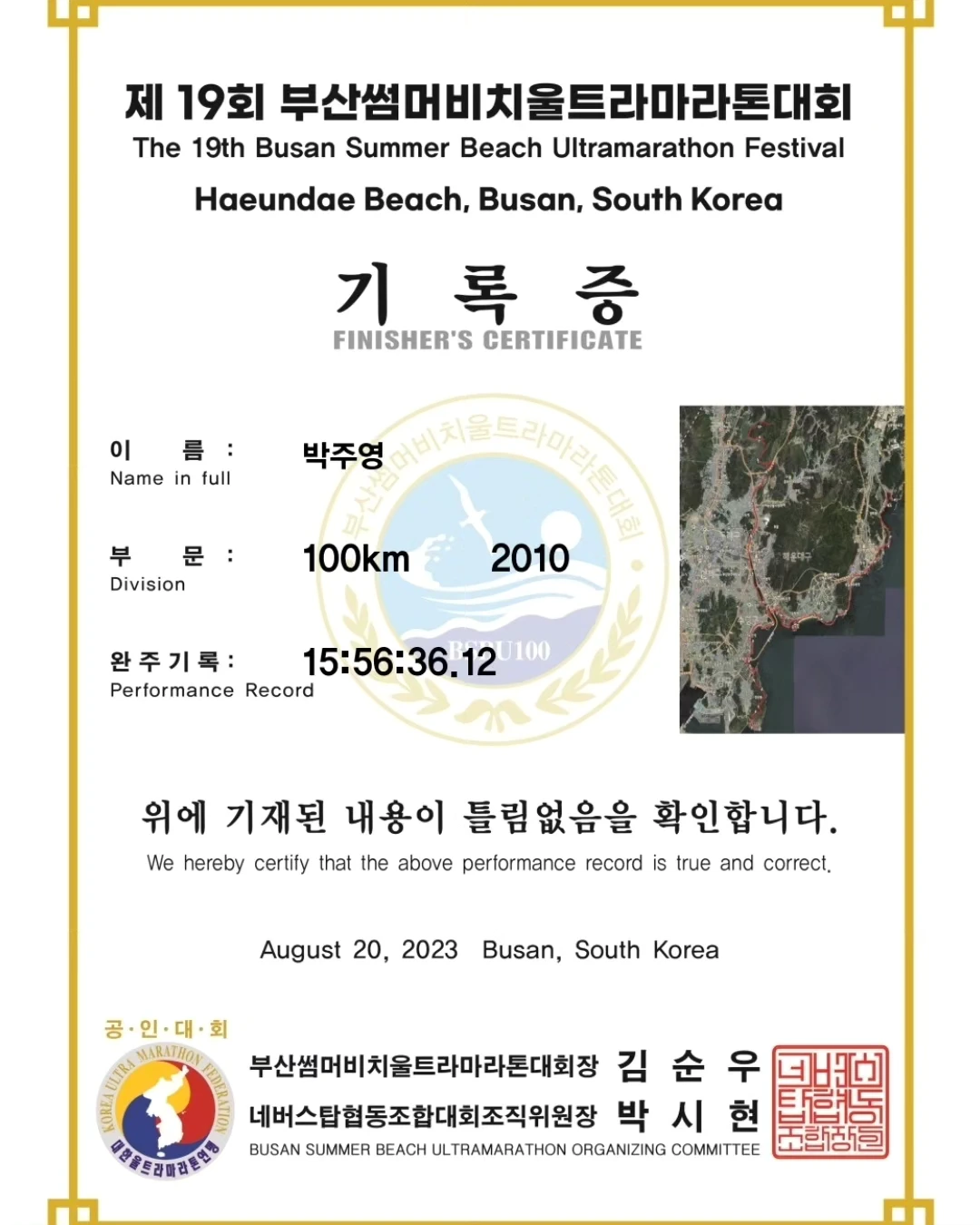 요트경기장으로 돌아 들어가니 길에 서있던 사람들이 응원을 해줬다. 우리에게 대단하다고 말했다. 그런 응원을 받으니 조금 더 힘이 났다. 바로 앞에 피니쉬라인이 보였다. 나와 준옹이님, 아촌님이 손을 잡았다. 준옹이님이 가운데서 잡은 손을 위로 들었다. 눈물이 울컥 나올 것 같았다. 왜 눈물이 나올 것 같았는지는 모르겠다. 혼자였으면 할 수 없었을 일을 준옹이님과 아촌님 덕분에 같이 올 수 있어서 고마워서 그랬을 수도 있고, 결국 내가 해내었다는 생각에 그랬을지도 모른다. 그냥 그 0.1초도 안 되는 순간에 슬로비디오처럼 100Km를 달렸던 모든 순간들이 필름처럼 지나갔다. 막 눈물이 나는 것은 아니었지만 코끝이 찡하고 가슴에서 벅찬 무언가가 올라왔다.