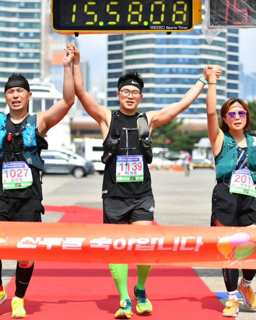 또 눈물 날 것 같았다. 감동적인 맛이었다. 커피만큼 강렬하지는 않았지만 힘이 올라왔다. 설레임은 마치 100K 울트라 마라톤을 뛰는 사람들이 마지막 2~3Km를 남겨놓고 먹으라고 회사에서 만들어놓고 편의점에서 파는 것 같은 운명적인 느낌이었다. 그렇게 설레임을 먹으며 걷다 뛰다 보니 요트경기장에 보였다. 거기서부터 진짜 열심히 뛰었다. 준옹이님과 아촌님 모두 잘 뛰었다. 준옹이님은 뛰면서 피니쉬 세리머니를 제안했다. 우리는 세 명이서 손을 잡고 들어가기로 했다. 요트경기장이 보여서 한 100~200m만 뛰면 되는 줄 알았는데, 한참을 더 뛰어들어갔다. 나는 요트경기장을 보자마자 이제 나는 살았구나. 여기서는 내가 쓰러져도 나를 도와줄 사람이 많을 것이고, 내가 죽지는 않겠다는 생각을 했다. 그리고 그늘에서 뛰니 조금은 살만했다.