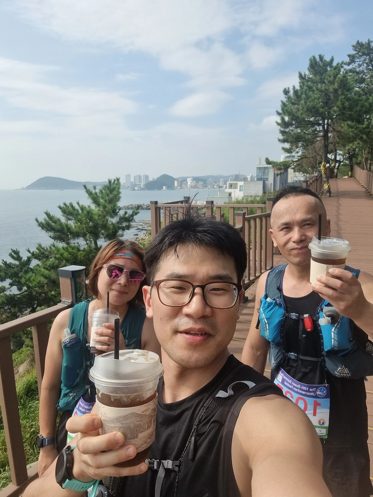 그래도 걸어가든 뛰어가든 한발 한발 내딛고 있다는 사실이 중요했다. 거의 끝이 보였기 때문에 마지막 힘을 짜내보기로 마음먹었다. 송정역 CP에 가까스로 도착했다. 이제 여기가 마지막 CP였다. 수박화채는 이제 없다고 했다. 다른 건 못 먹어도 수박화채는 먹을 수 있었는데, 아쉬웠다. 한 10Km 정도가 남았다고 했다. 이제 딱 10Km만 토요일 아침 이지런 한다고 생각하고 뛰어가면 되는 것이었다. 이제부터 시작이라고 생각하면 된다. 송정역에서 청사포 쪽으로 데크길은 그나마 가기 편한 길이었다. 문텐로드가 걱정되긴 했지만 달려 보기로 했다. 올드 머그를 지나는데, 준용이 님이 아촌님과 나에게 커피를 사갈 테니 먼저 가라고 말했다. 커피를 사 오면 준옹님은 커피를 들고 우리가 있는 곳으로 오기 위해서 더 빨리 뛰어야 된다. 그렇지만 준옹이님에 대한 걱정보다도 커피를 먹고 싶다는 열망이 더 커서 항상 거절과 사양을 잘하는 나는 그 순간만큼은 괜찮으니 사러 가지 말라는 말을 차마 내뱉지 못했다. 사람은 원래 위기 앞에 이기적이게 된다. 그래도 너무 빨리 가면 안 될 것 같아 앞서가던 아촌님을 불러 세웠다. 천천히 뛰어서 600~700미터 정도 더 간 지점이었을 것이다. 조금만 서서 기다리자고 했다. 준옹이님이 뛰어올 길만 바라보았다. 작게 보이는 준옹이님이 양손에 아이스아메리카노 3개를 들고 빠른 속도로 뛰어 오고 있었다. 내가 눈이 좋은 것도 아닌데, 진짜 작게 보이는 준옹님의 얼굴과 손에 들린 커피까지 잘 보였다. 이건 갈망 때문에 나오는 초능력 같은 것이었다. 준옹이님이 그렇게 쏜살 같이 달려서 우리에게 커피를 내밀었고, 나는 받자마자 가뭄 때문에 쩍쩍 갈라진 논에 물을 대듯 커피를 쭉 마셨다.