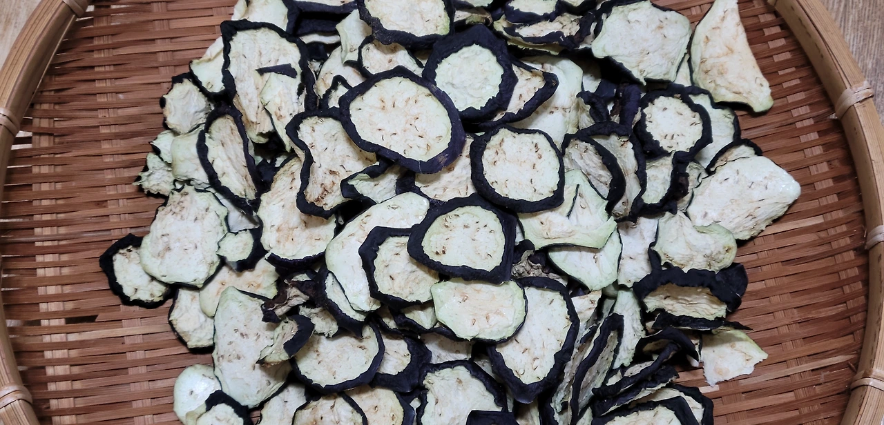 (건조 방법: 씻은 가지를 1cm 정도의 굵기로 썬 후 식품건조기에 60도, 3시간 건조 후 밀봉 보관)