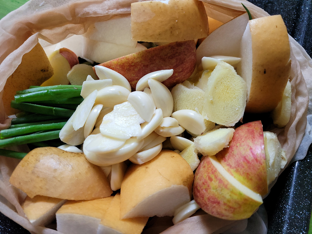 사과, 배, 마늘, 쪽파, 사진에는 빠진 생강도( 엄지크기 3개) 준비한다.