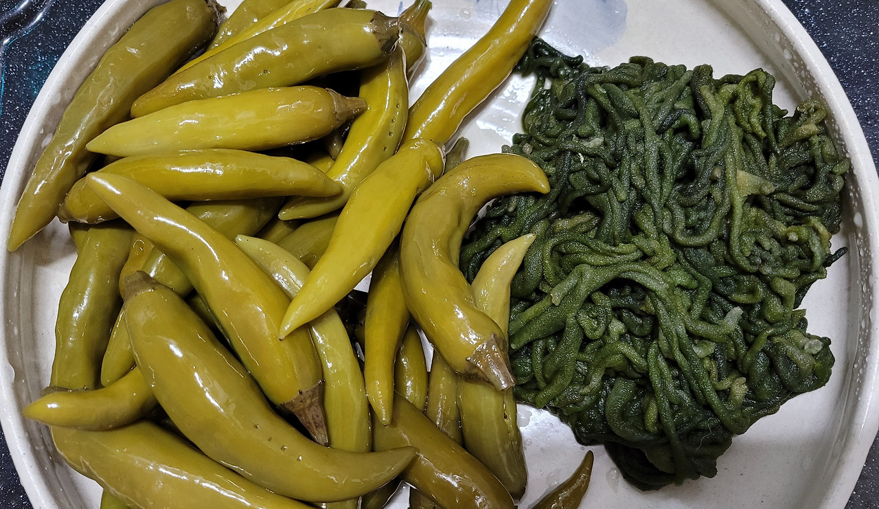 약간 간간한 소금물에 삭혀 둔 고추와