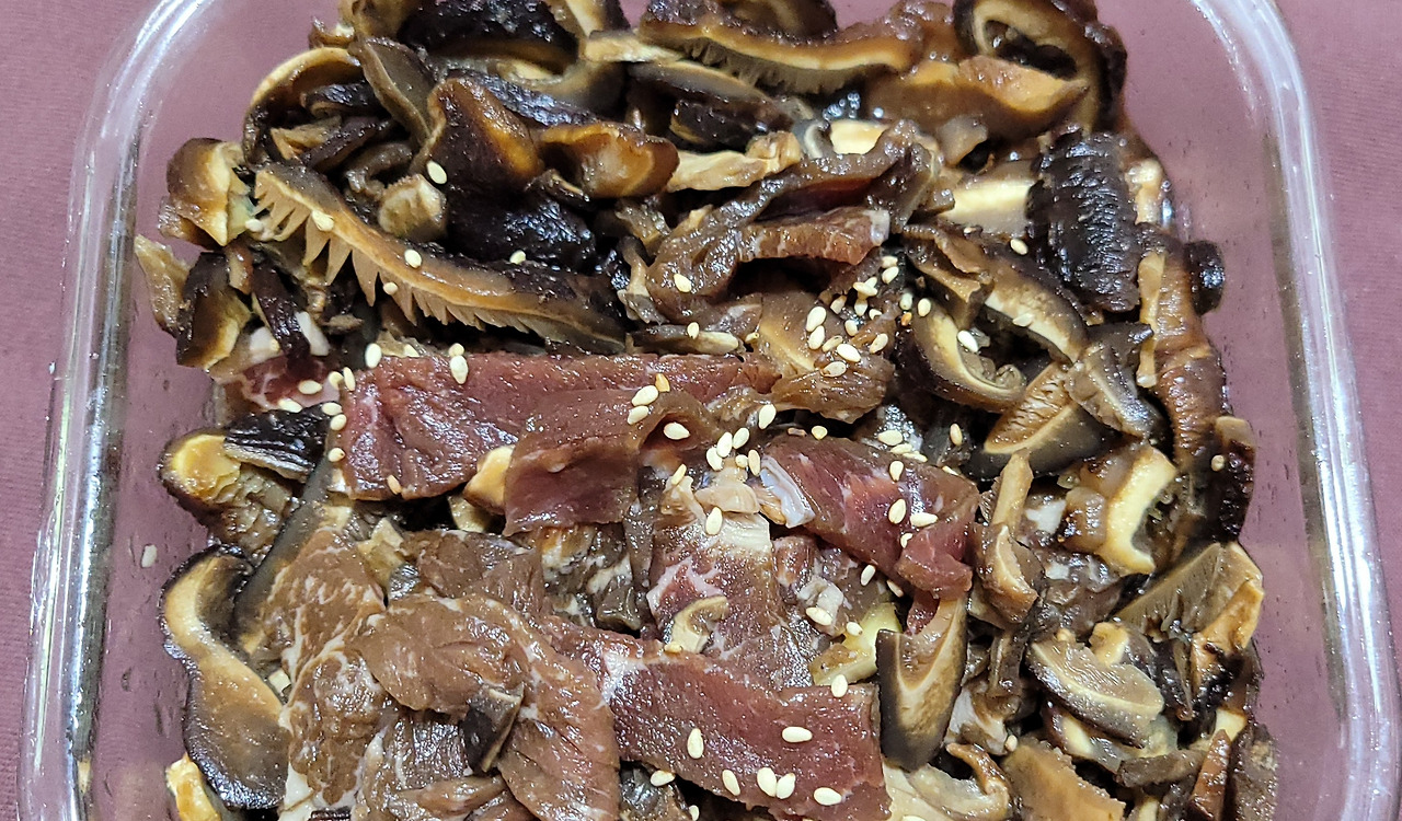*1.5cm 너비로 길게 썬 소고기와 채 썰어서 말린 표고버섯을 소스에 조물조물해 둔다.