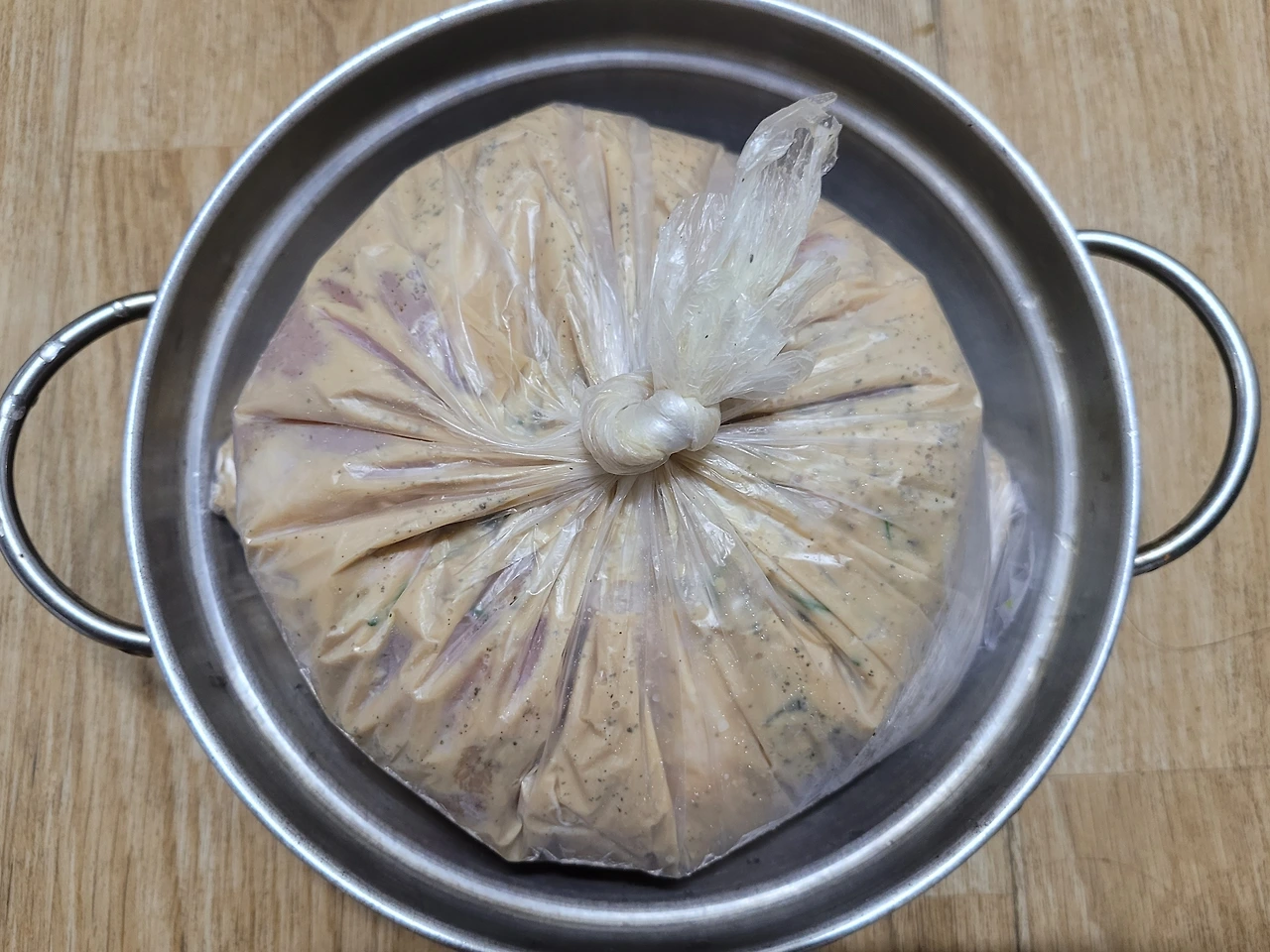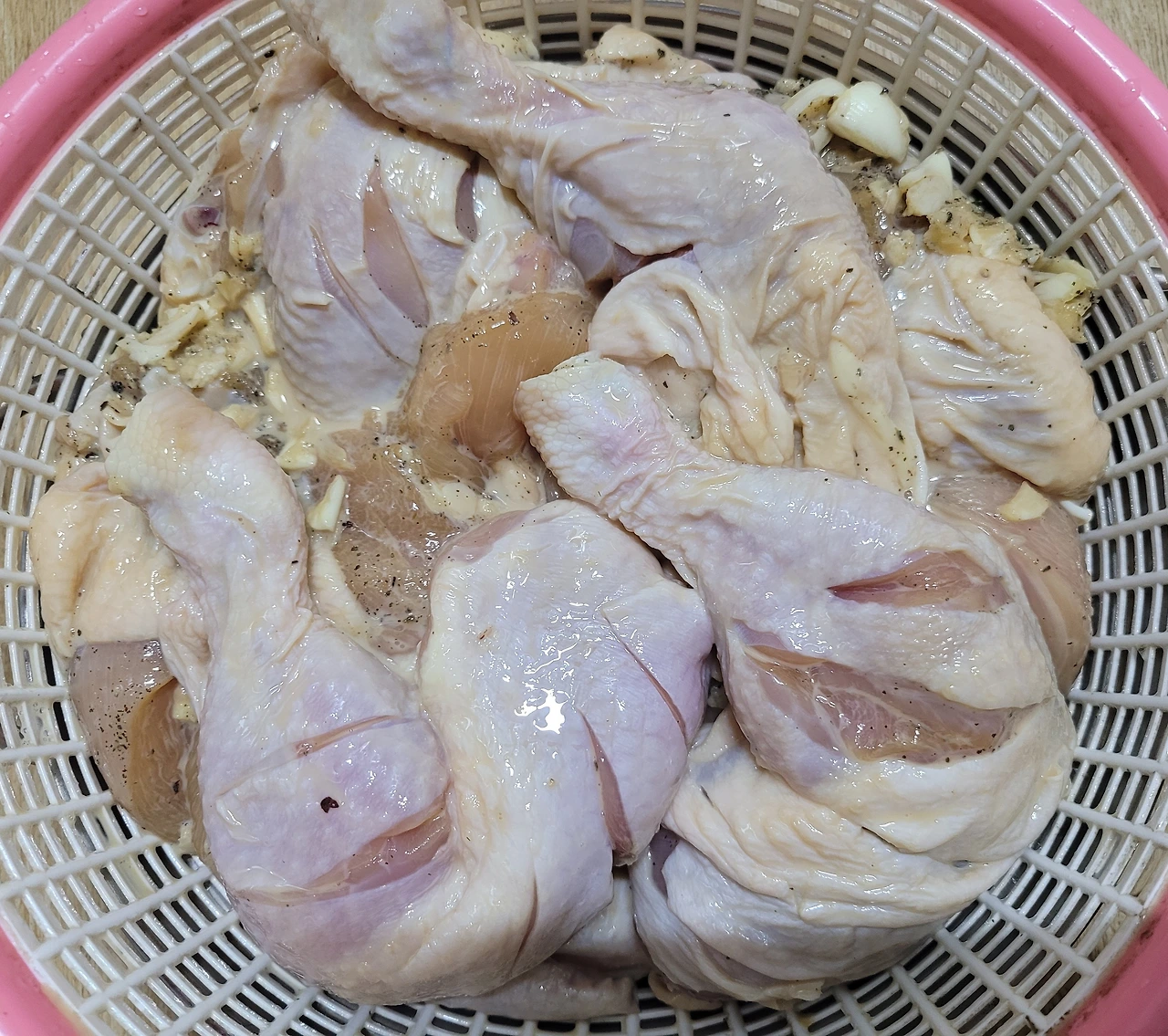 6. 숙성시킨 닭을 꺼내어 소쿠리에 바쳐