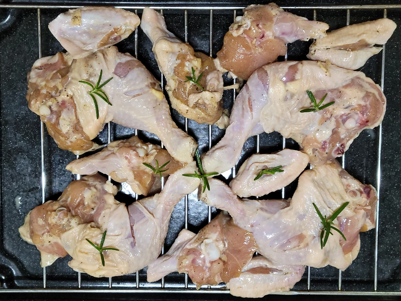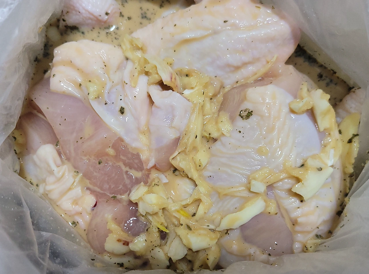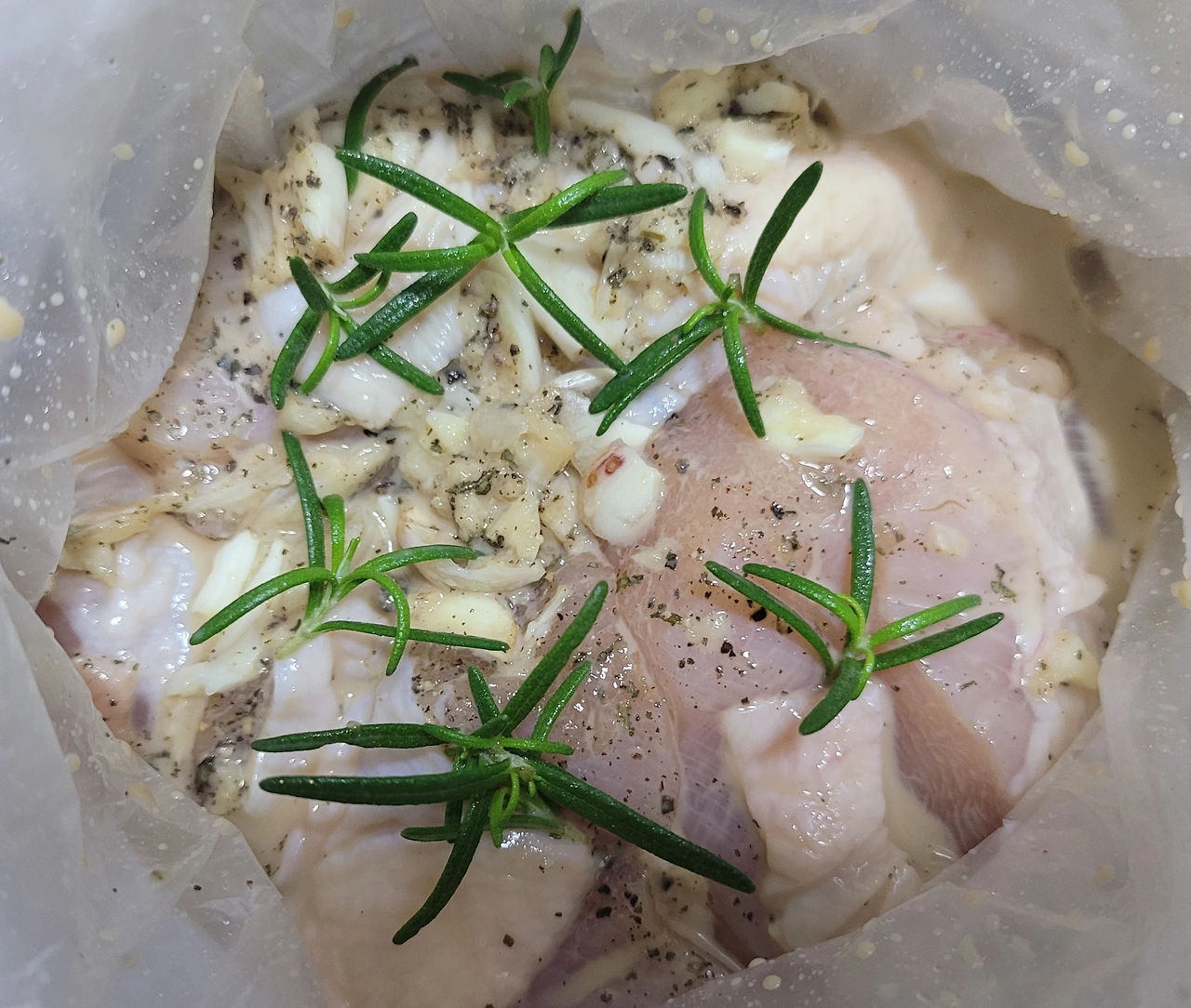2. 다듬어진 닭을 1회용 비닐봉지 두 겹으로 해서 담고 후추, 로즈메리 가루를 뿌린다.