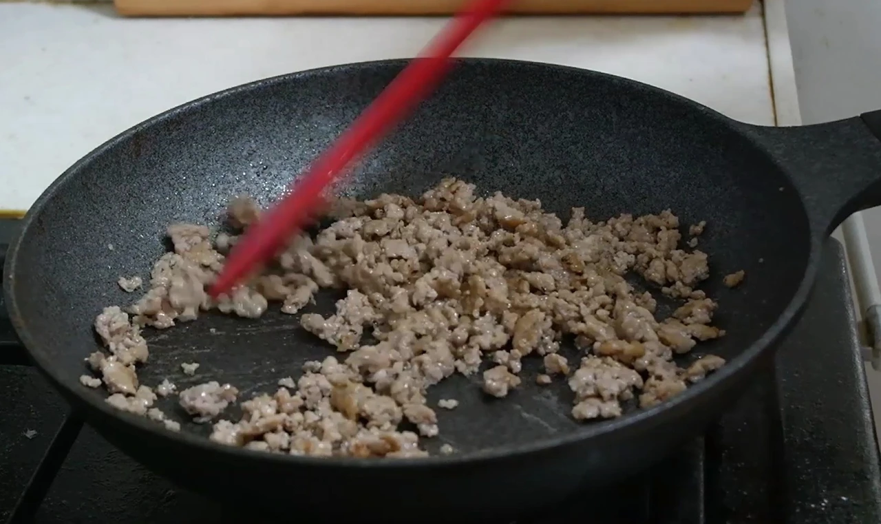 간을 맞춘 후 볶은 돼지고기, 부침가루를 넣어 되직하게 만든 후