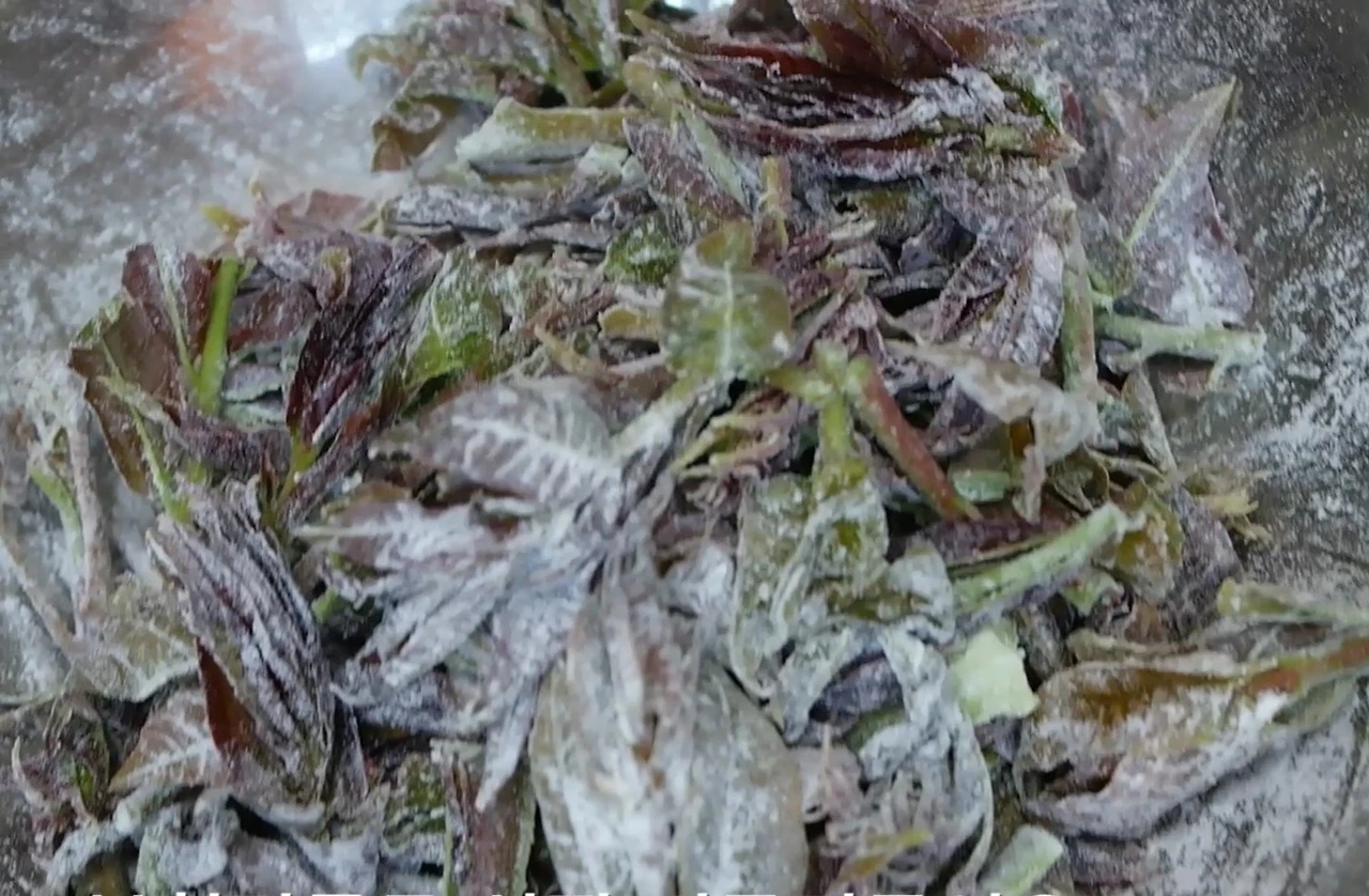 넓은 볼에 가죽나무 순을 담고 부침가루를 묻혀준다.