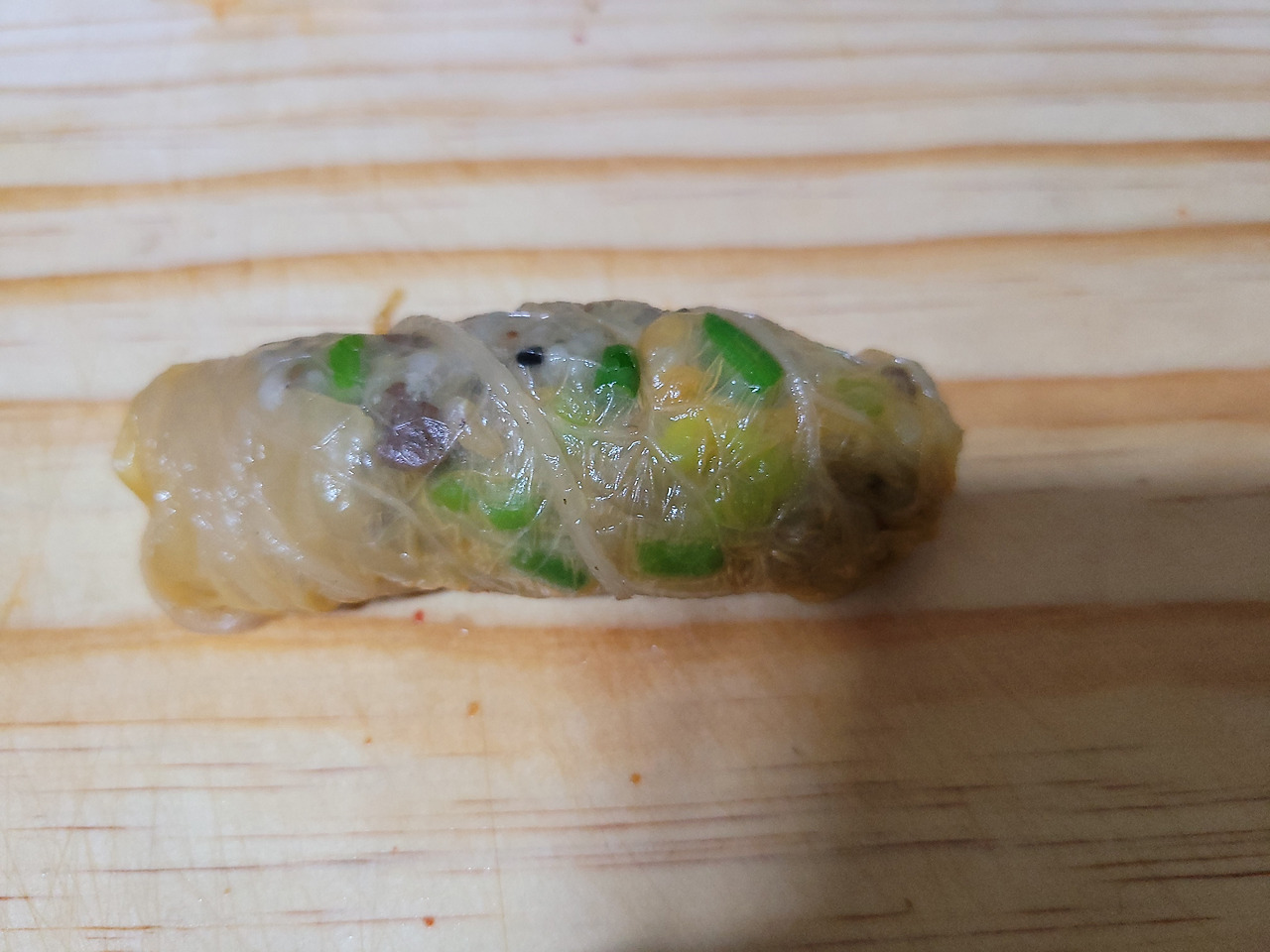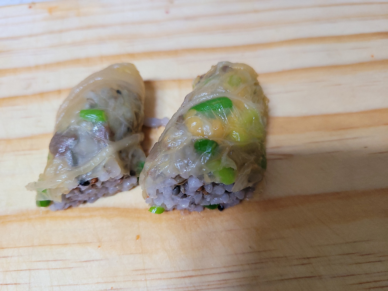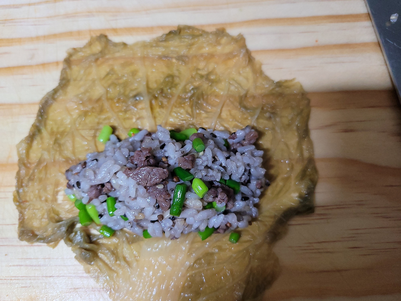2. 묵은지 뒷면에 밥을 놓아야 싼 후 매끄럽고