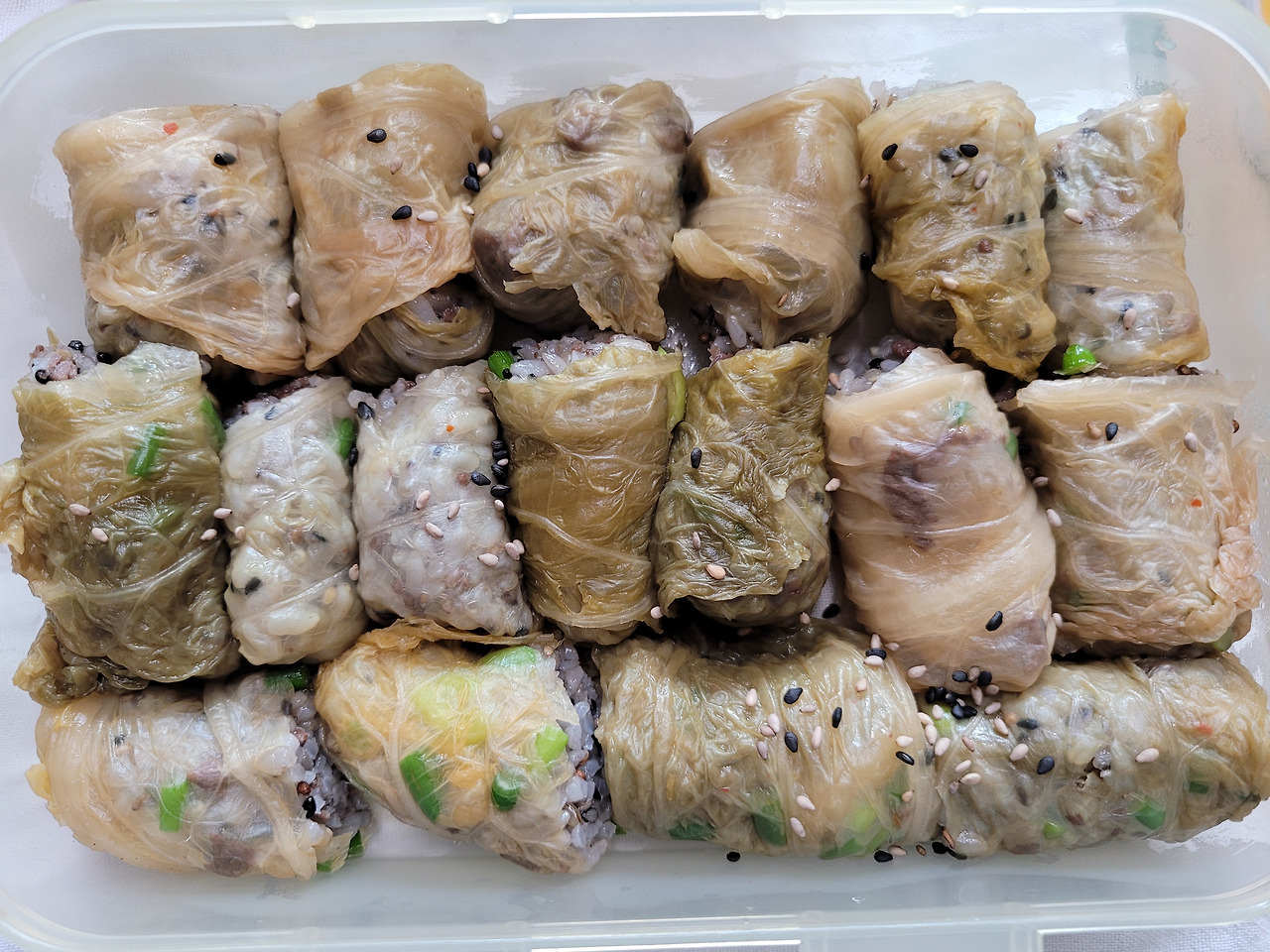 오늘 도시락은 어제저녁부터 준비가 필요한 묵은지 쌈밥이다. 딸은 물론이고 온 식구들이 무한정 먹어대는