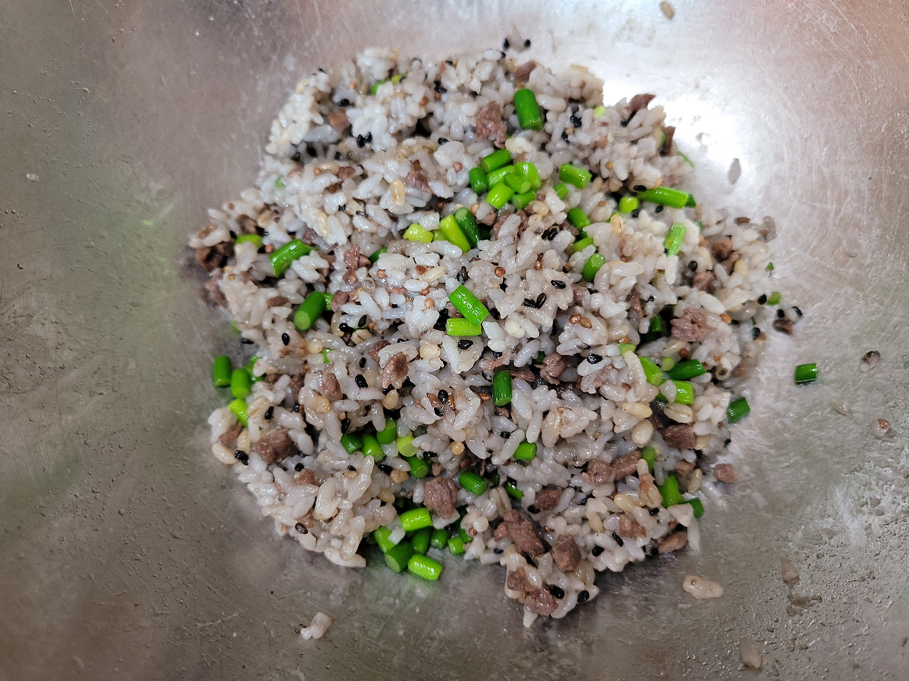 의 밥과 참기름, 통깨를 넣고 섞어 준다.