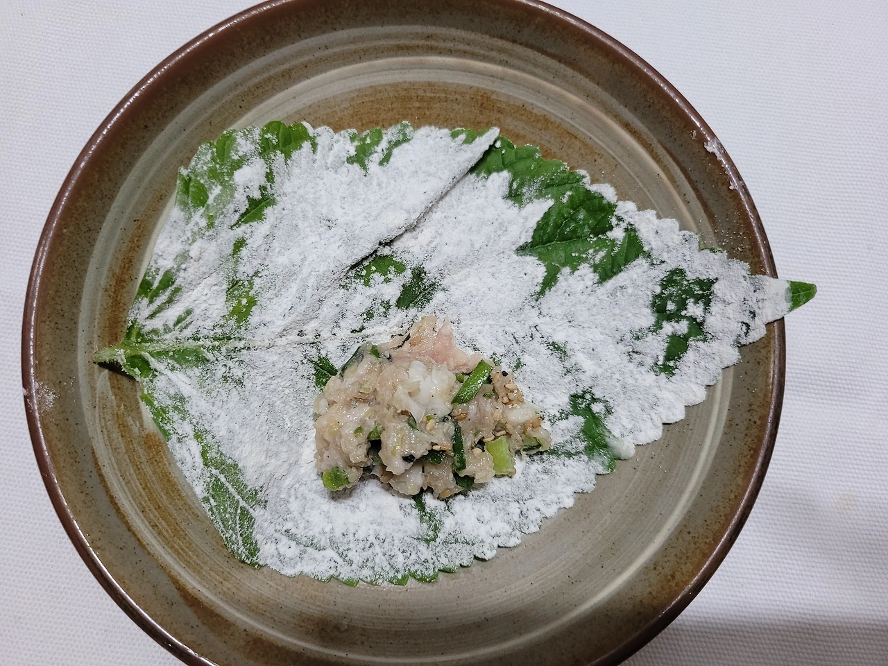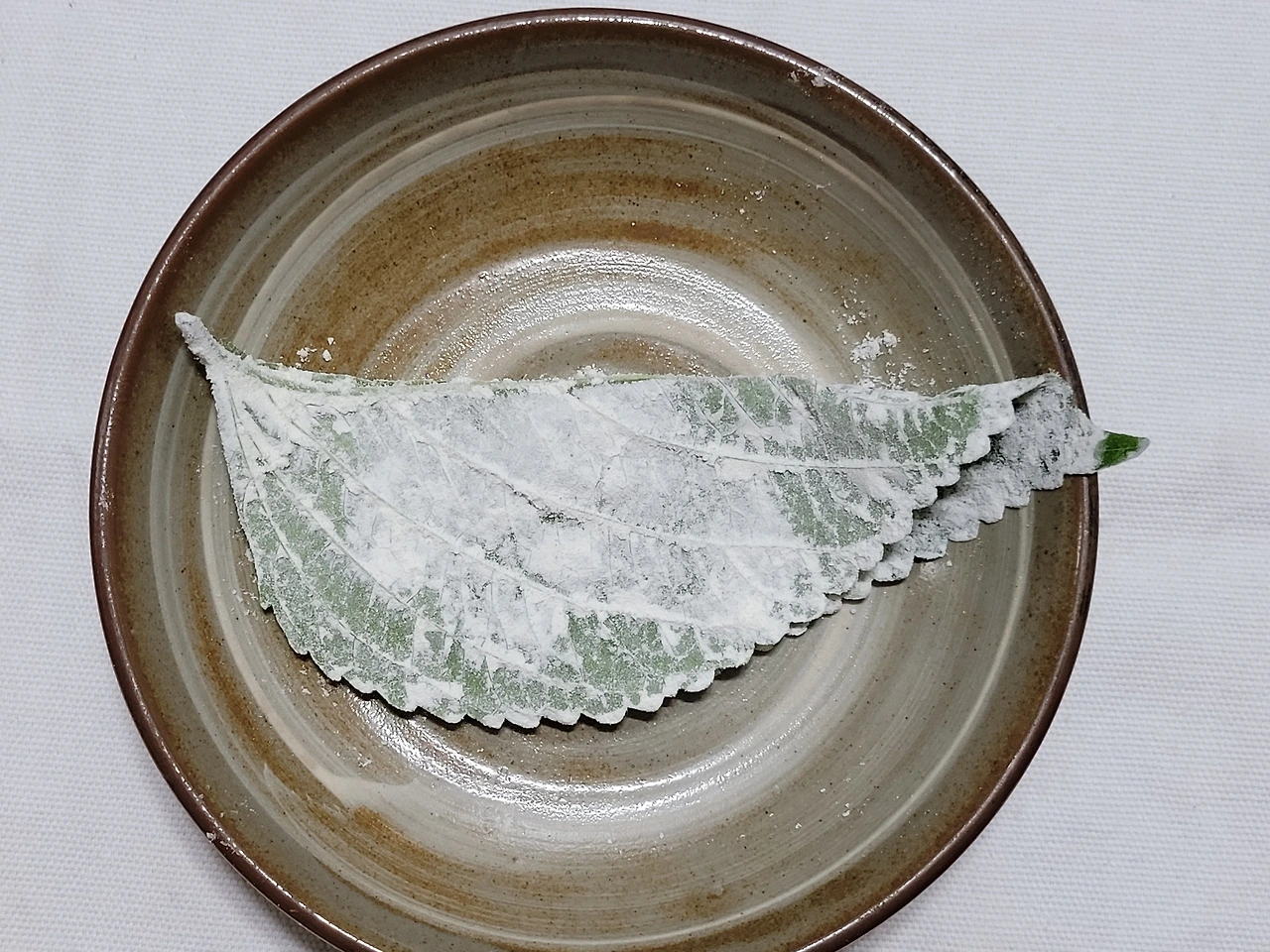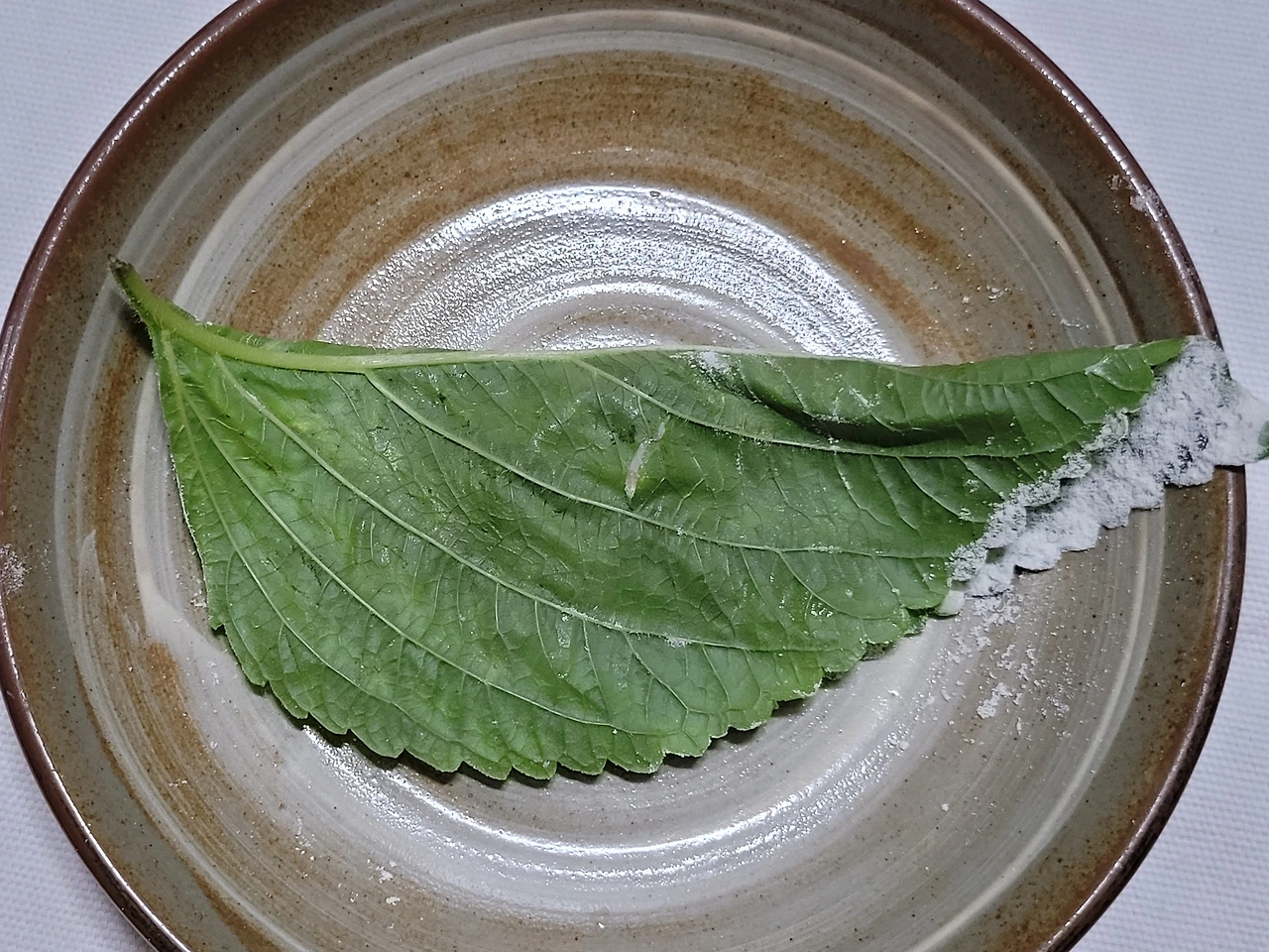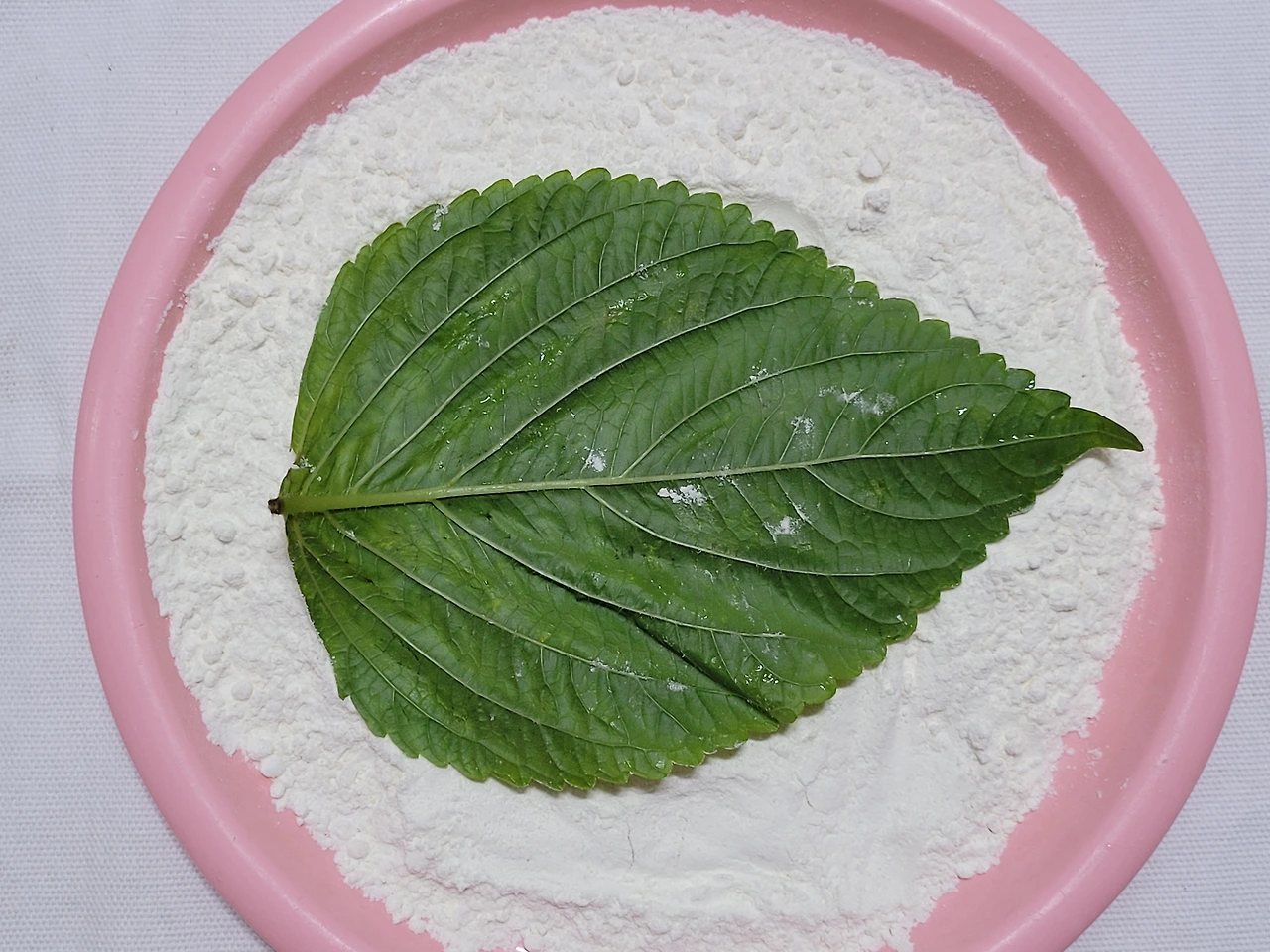 깻잎의 안쪽 부분에 부침가루를 묻힌다.
