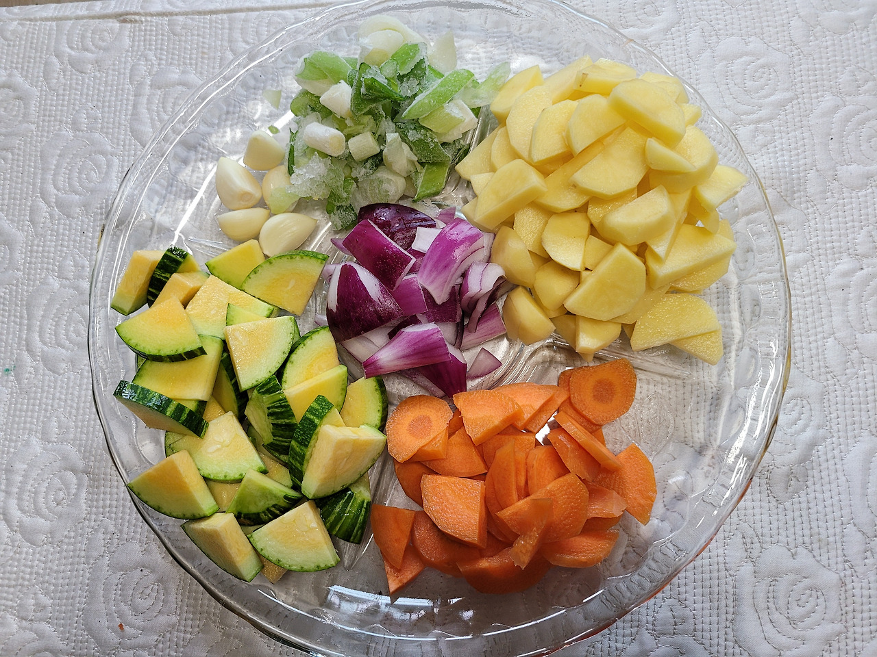 2. 오늘 준비한 야채는 애호박, 당근, 자색양파, 감자 등은 좋아하는 재료는 많이 넣고, 싫어하는 재료는 적게 넣어도 된다. 마늘 5톨, 대파 1대를 준비해 둔다.