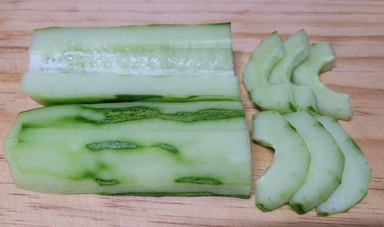 1. 밭에서 갓 따온 싱싱한 오이 1/2개를 껍질은 필러로 벗겨내고 속은 숟가락으로 제거한 후 반달모양으로 썰어 준비한다.