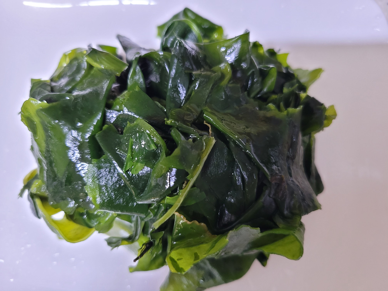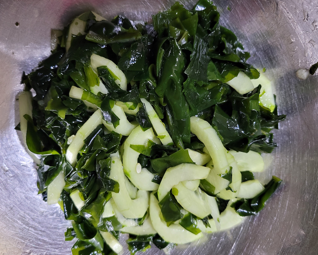 1. 마른미역 10g 정도를 찬물에 10분 정도 불려서 바락바락 주물러 깨끗이 씻어 준다. 오래 불리면 먹을 때 쫄깃한 식감이 떨어진다. 오이에서 나오는 수분으로 만드는 과정에서 더 불려진다.