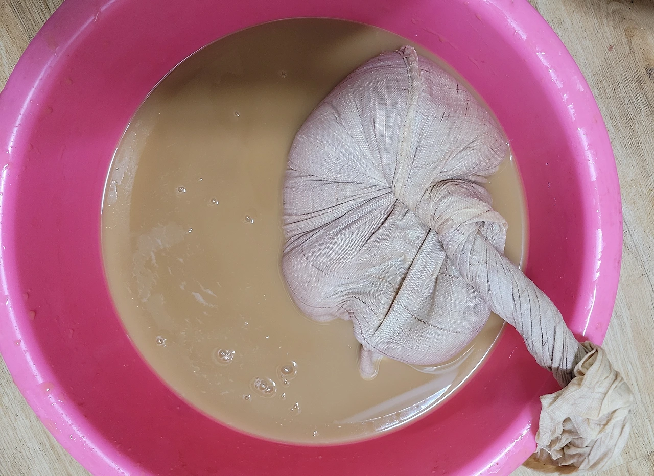 면이나 삼베로 만든 주머니에 간 도토리물을 부어준 후 조물조물하면 전분이 빠져나온다.