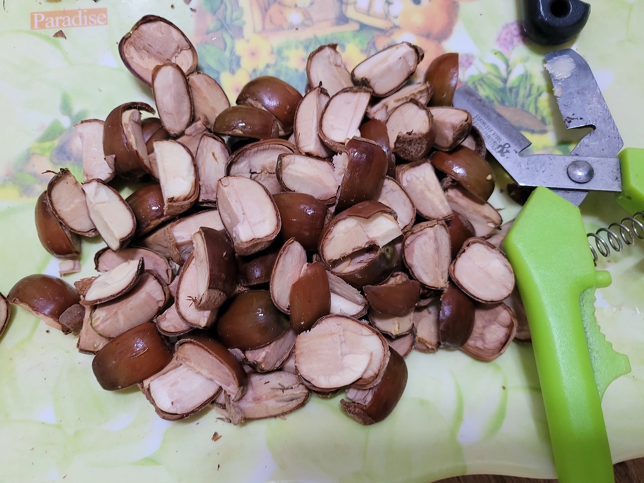 잘라진 도토리 껍질 양쪽을 잡고 뒤로 젖히면 알맹이가 쏙 빠진다. 도토리에 수분이 있을 때 자르면