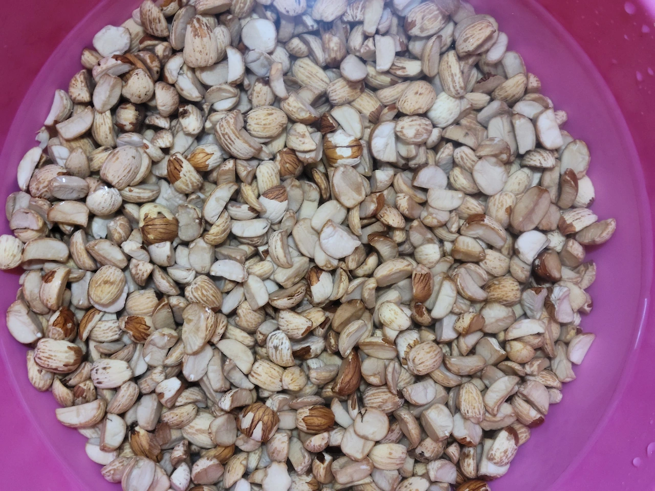 알맹이는 찬물에 하루 담가 놓았다가 손으로 비벼서 물을 자주 바꿔 주면서 속 껍질을 흘러 보낸다.