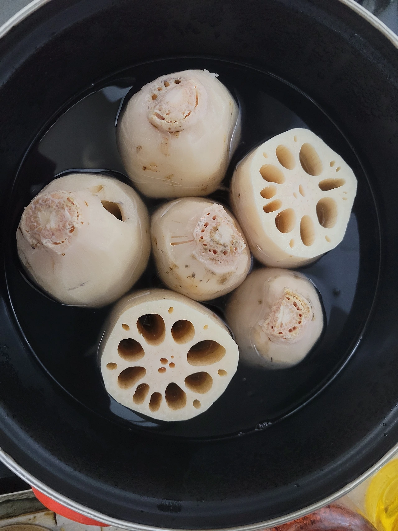 연근이 잠길 정도로 야채육수를 붓고 뒤적이며 익힌다.