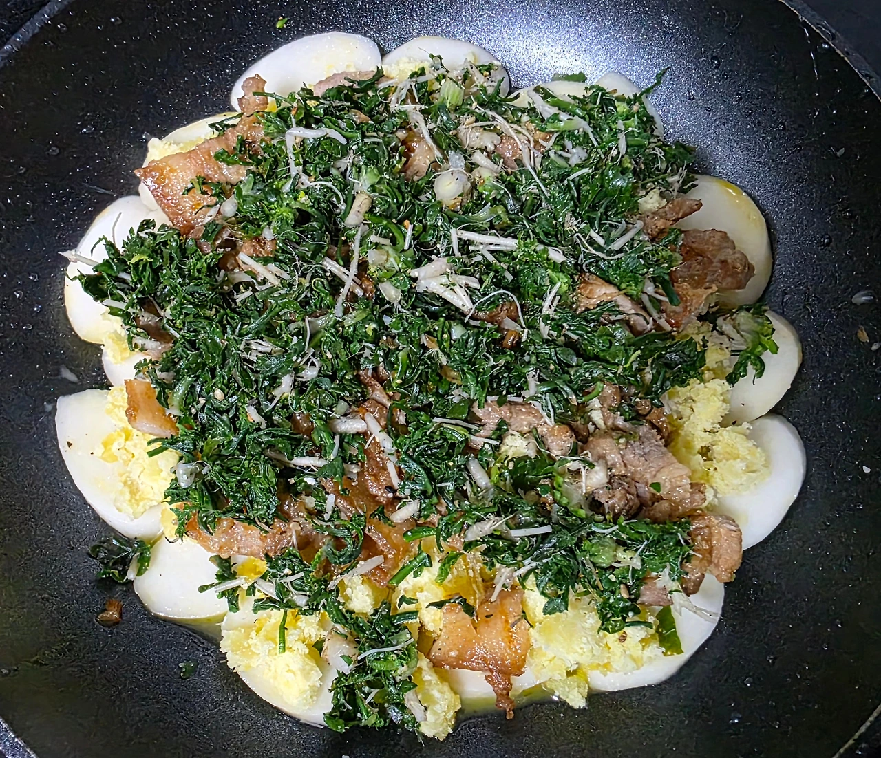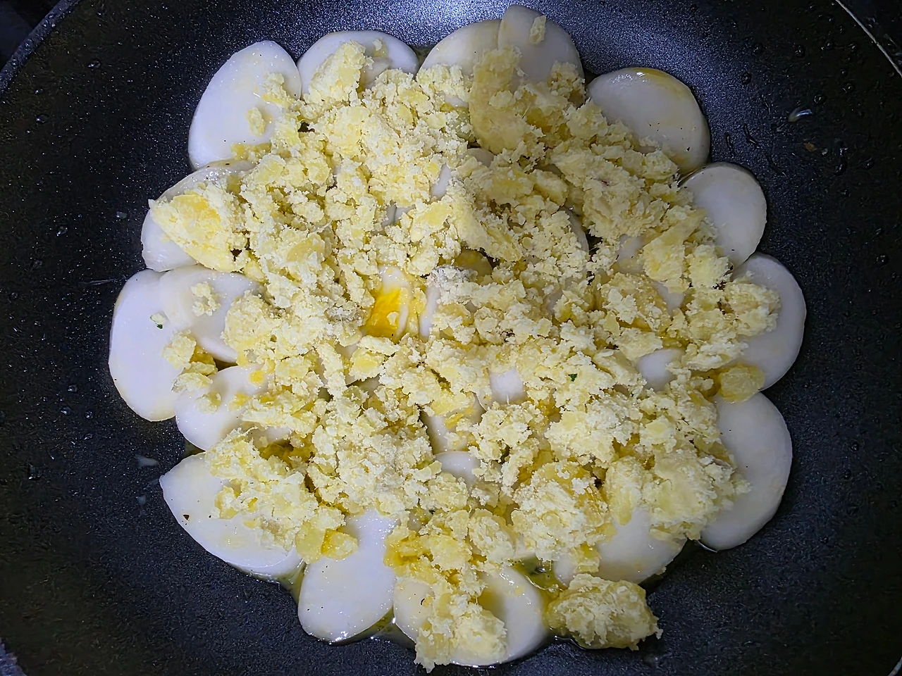 떡을 빈 틈 없이 깐 후 그 위에 남은 계란물을 꼼꼼하게 부어 준다.