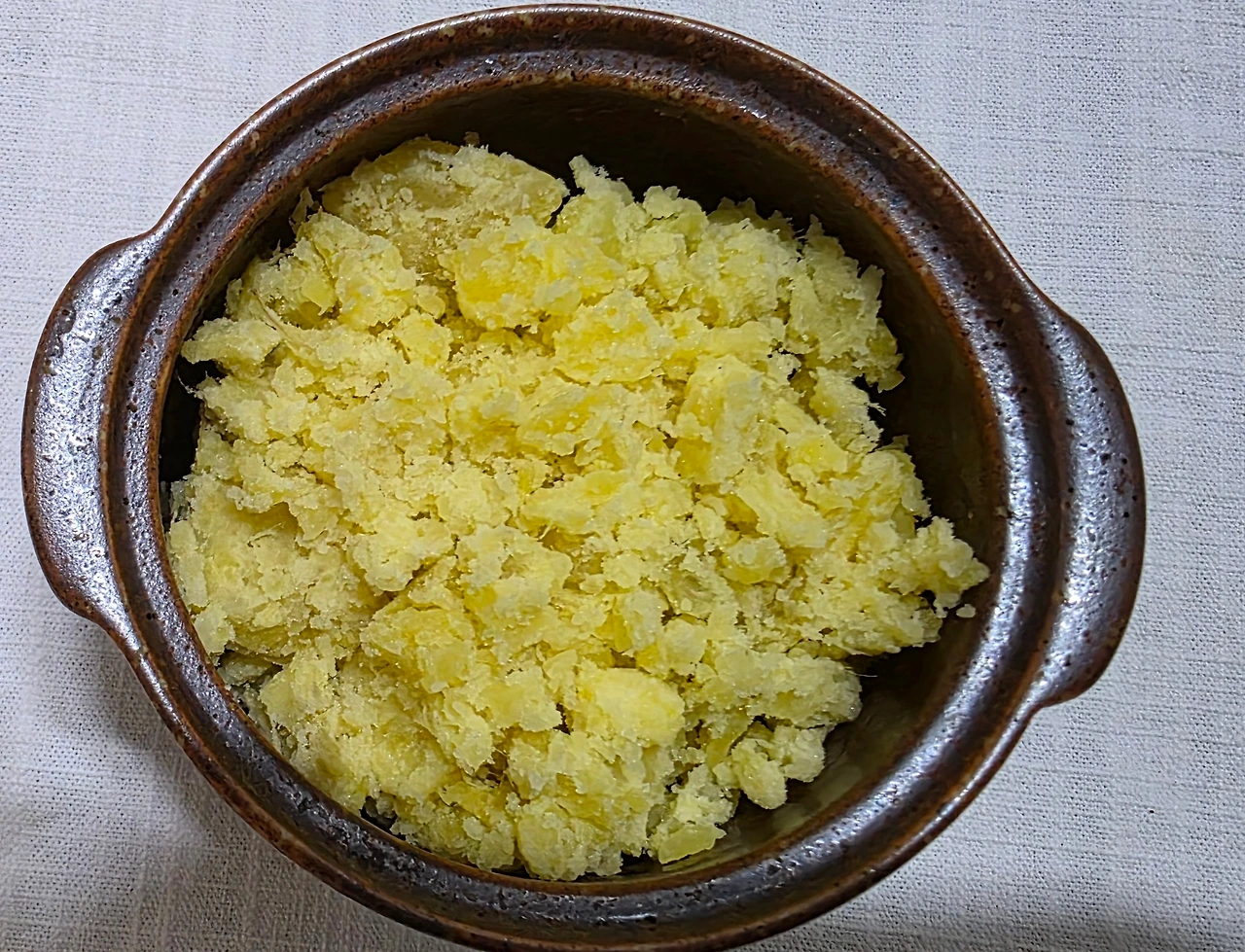 오븐에서 구워 뜨거울 때 껍질을 벗긴 후 매셔로 포슬하게 으깼다.