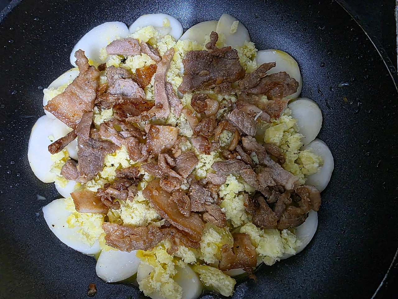 고구마 위에 간을 한 후 볶은 돼지고기 앞다리살(소고기 또는 베이컨)을 올린다.