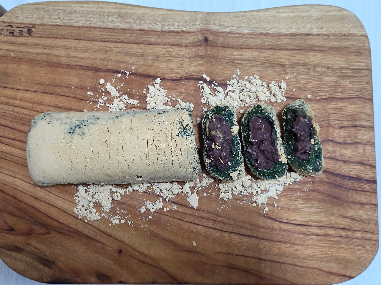 쑥 인절미 속에 넉넉하게 달콤한 통팥을 넣고