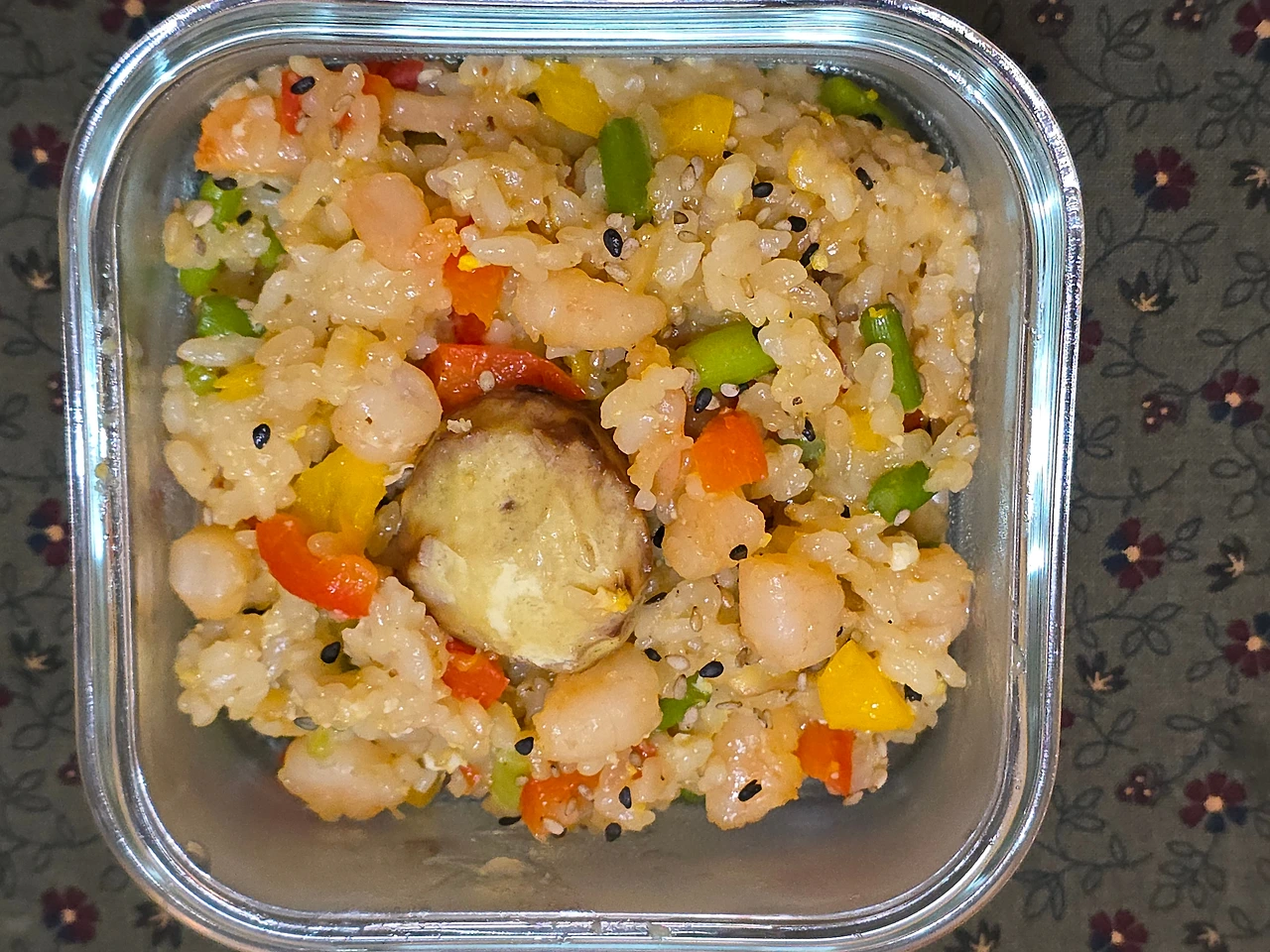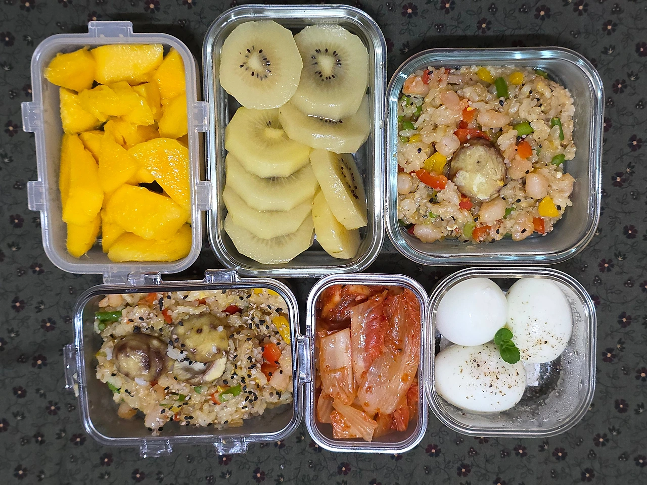 오늘은 새우 파프리카 볶음밥, 무항생 삶은 계란, 묵은지, 망고, 골드키위이고
