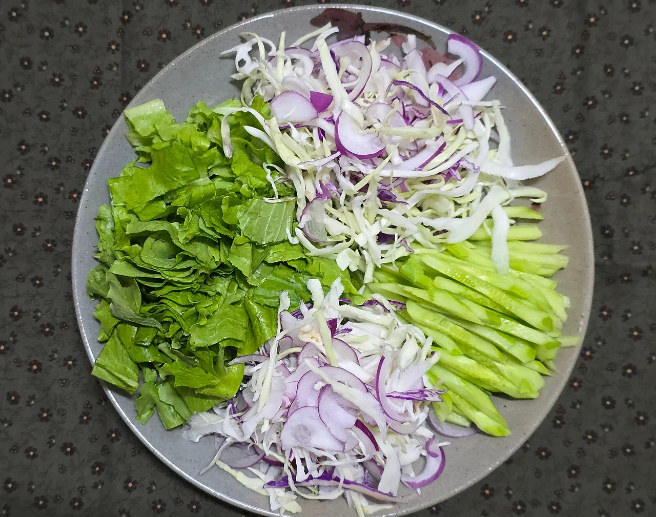적양배추와 양배추, 보라색 양파는 채를 썰어 씻은 후 찬물에 담가 둔다.