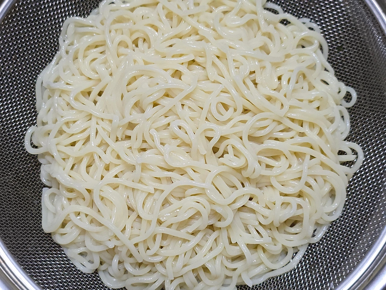 : 면 750g을 준비해서 찬물에 붙어 있는 면을 풀어준 후