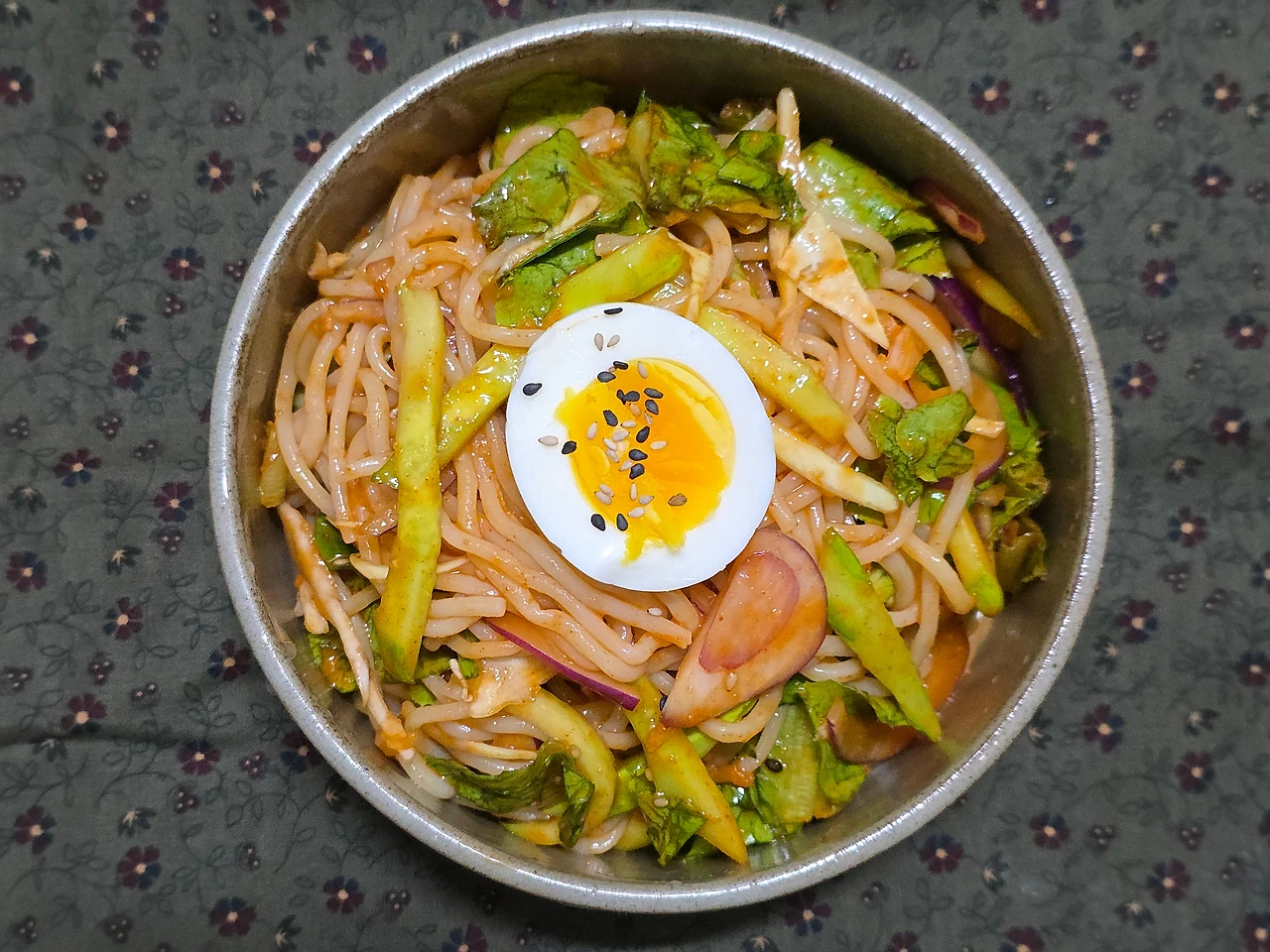 야채를 넣고 다시 양념장을 넣어 간을 맞추고 참기름 1 큰 스푼, 통깨를 뿌려 살살 버무려 준다.
