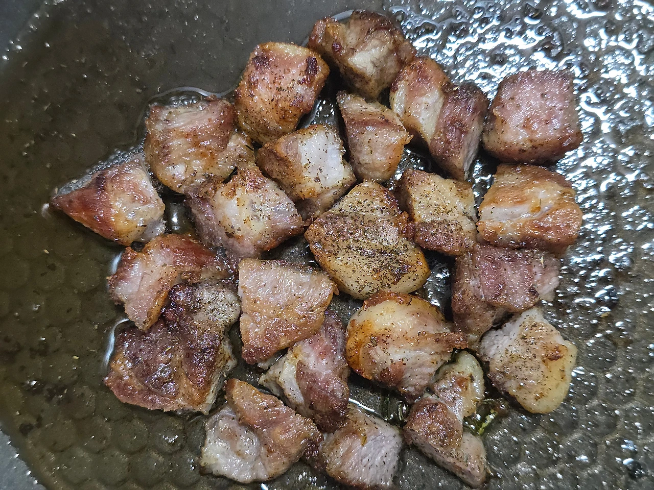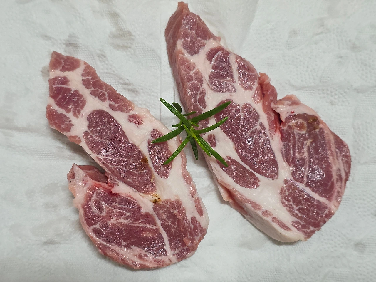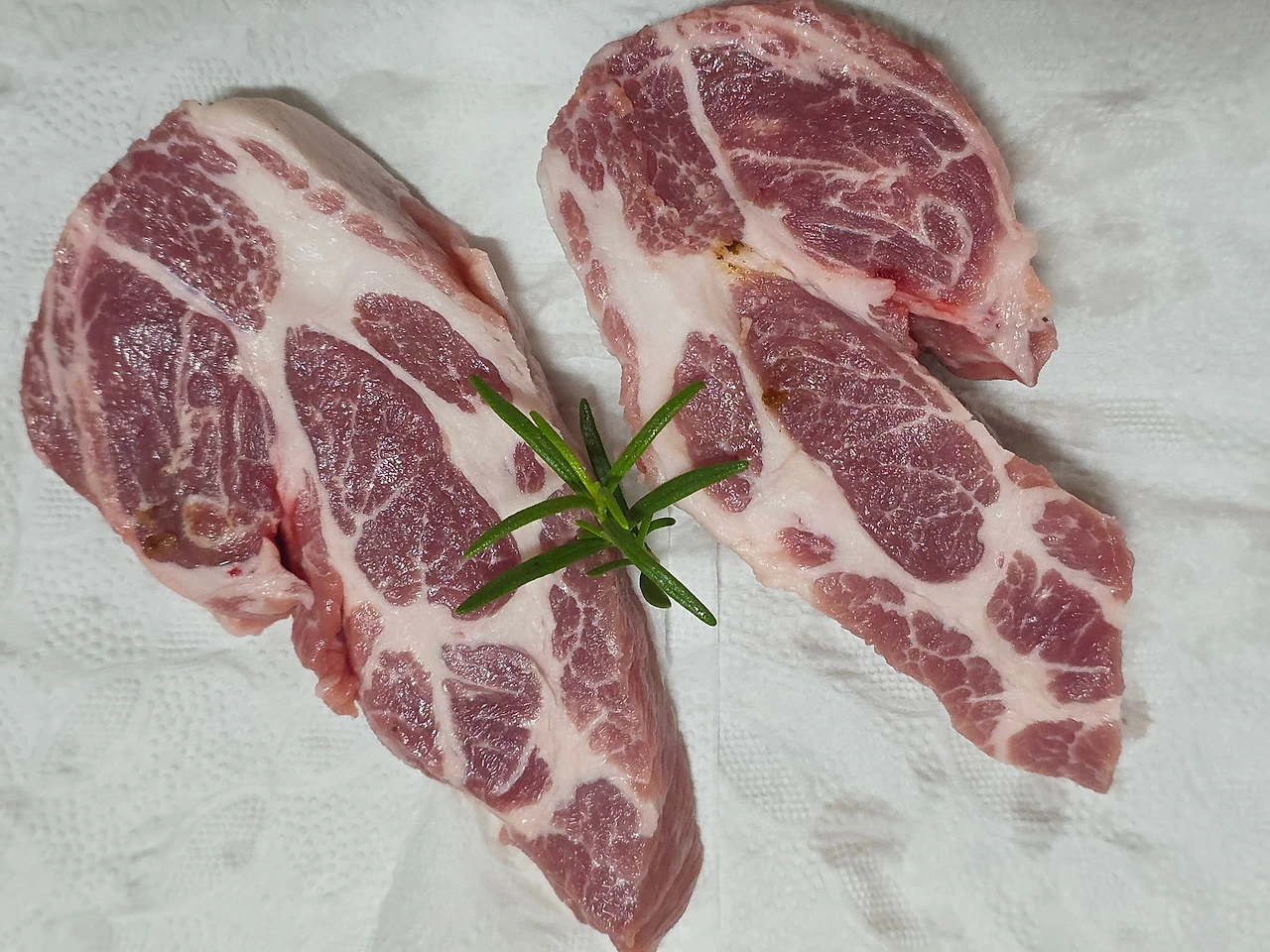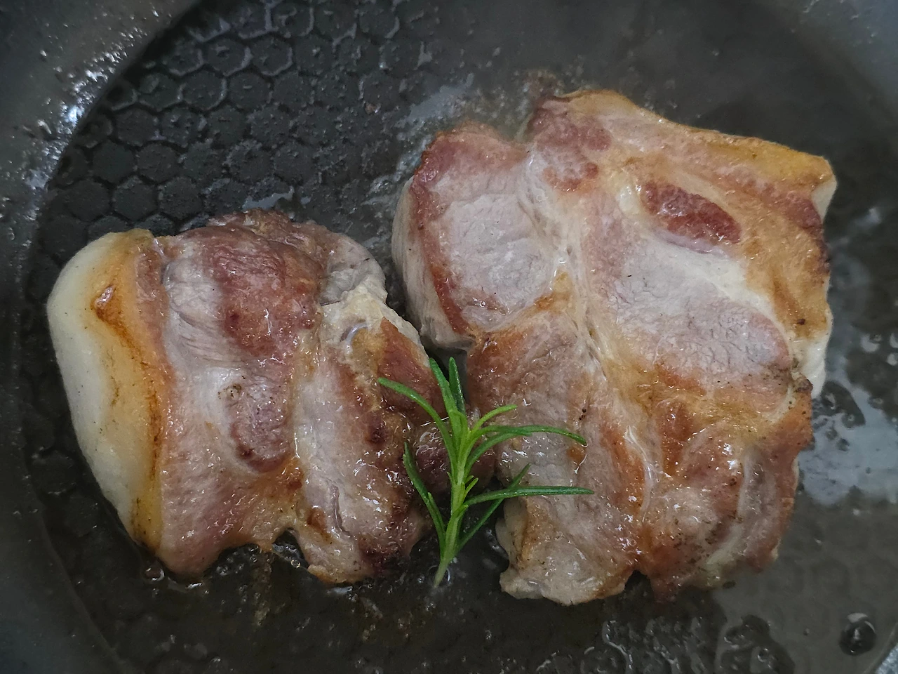 통목살을 사서 2.5cm 두께로 썰어 허브소금과 후춧가루로 1시간 재워둔다.