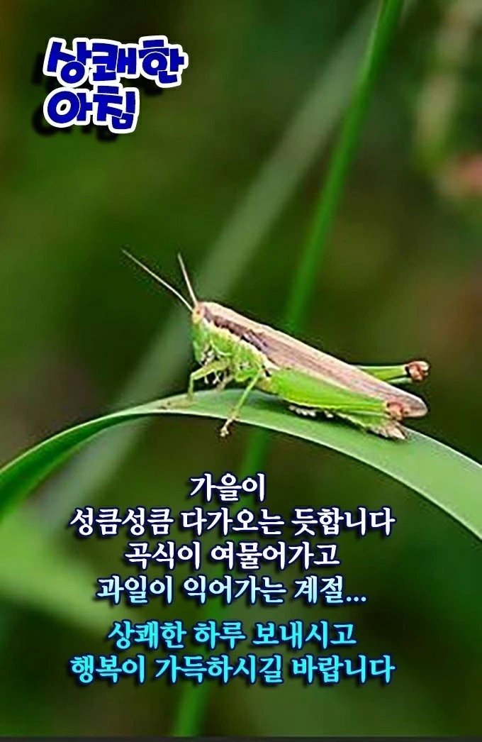 어제 하루 종일 비가 온 뒤 더위가 가셨다. 여름 내 매미가 나무에 붙어 고막을 찢던 소리가 흔적도 없이 사라졌다. 그 자리를 귀뚜라미가 잽싸게 자리를 잡고 돌 담사에서 노래를 부른다. 푸른 하늘가에 흰 구름이 두둥실 떠가고, 코스모스가 실바람에 하늘거리는 정취가 느껴진다. 농촌에는 가을볕에 벼가 알알이, 배, 사과, 감, 대추 밤이 토실토실하게 익어간다.