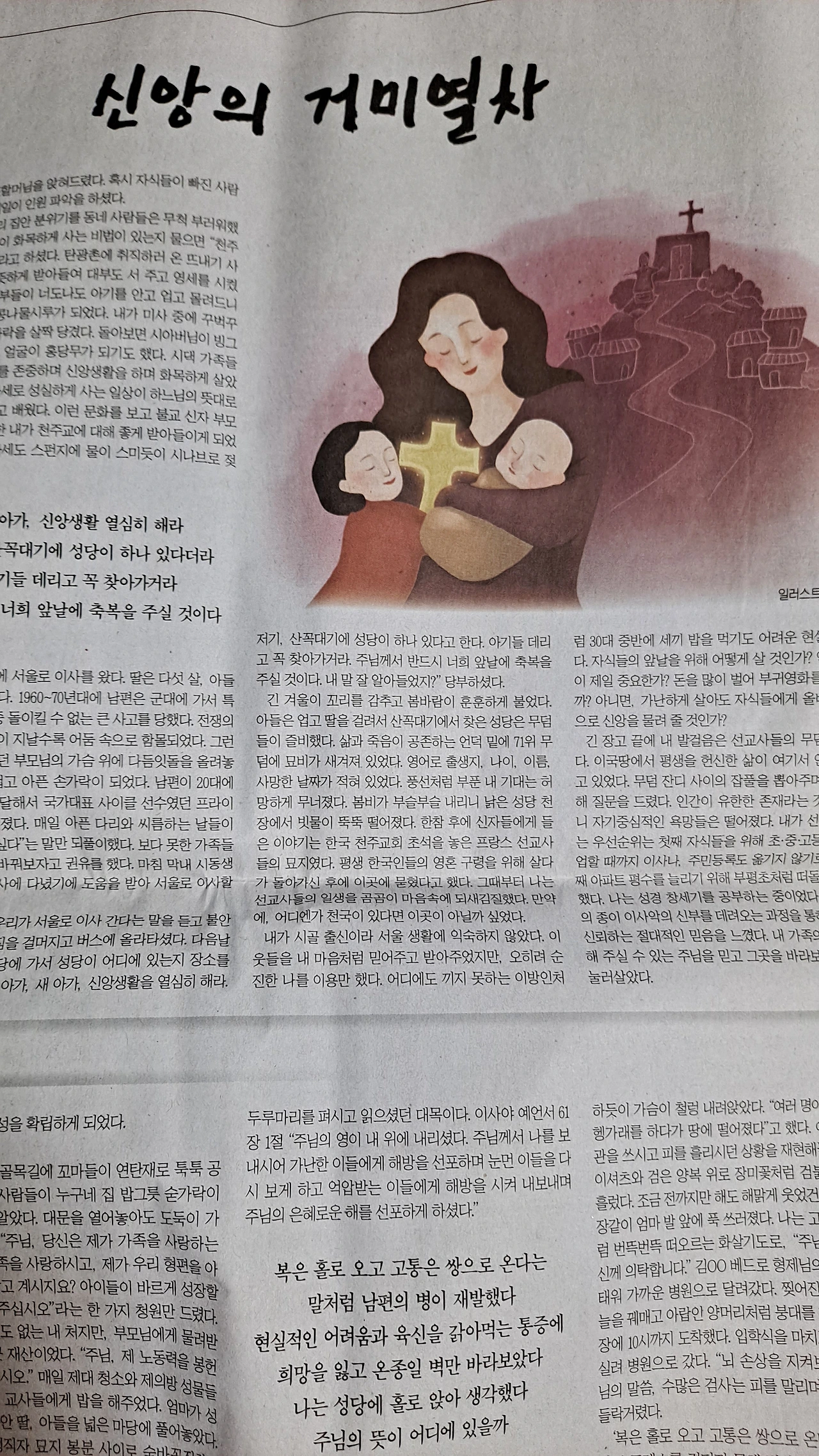 “새아가, 신앙생활을 열심히 해라. 저기, 산꼭대기에 성당이 하나 있다고 한다. 아기들 데리고 꼭 찾아가거라. 주님께서 반드시 너희들 앞날에 축복을 주실 것이다. 내 말 잘 알아들었지?”