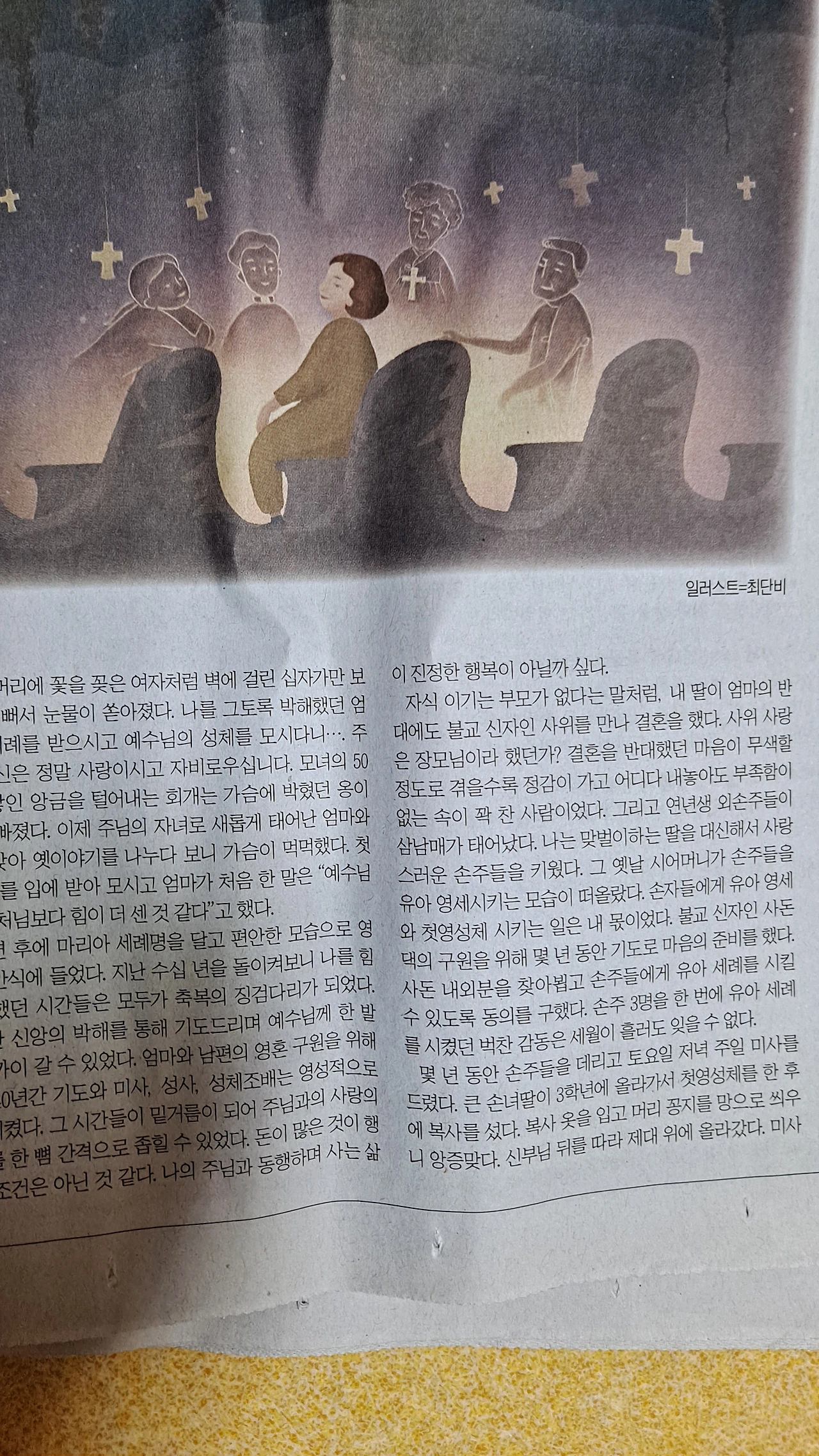 천지개벽이 일어났다. 매일 밤, 나의 잠꼬대는 ‘제 엄마를 영혼을 구원해 주셔서 감사합니다.’ ‘제 남편도 구원해 주셔서 감사합니다.’ 머리에 꽃을 꽂은 여자처럼 벽에 걸린 십자가만 보아도 기뻐서 눈물이 쏟아졌다. 나를 그토록 박해했던 엄마가 영세를 받으시고 예수님의 성체를 모시다니. ‘주님, 당신은 정말 사랑이시고 자비로우십니다.’ 모녀의 50년간 쌓인 앙금을 털어내고 회개하니 가슴에 박혔던 응어리도 쏙 빠졌다. 이제 주님의 자녀로 새롭게 태어난 엄마와 마주 앉아 옛이야기를 나누다 보니 가슴이 먹먹했다. 첫영성체를 입에 받아 모시고 엄마가 처음 한마디 했다.