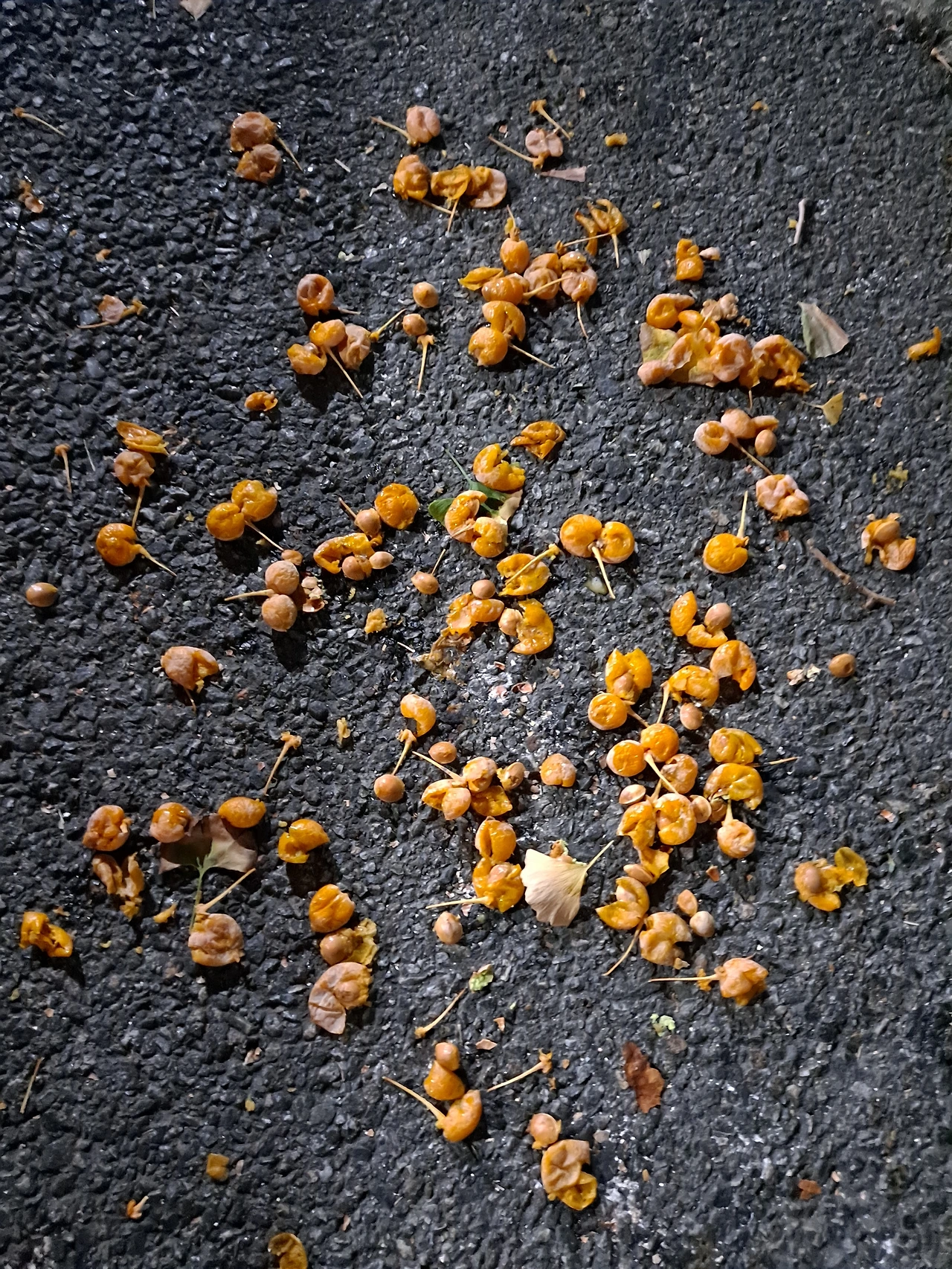 저녁 어스름에 시장으로 향했다. 가로등 불빛 아래 황금열매 나무 밑을 지나갔다. 여름내 파랗던 은행이 추석을 앞두고 누랗게 익었다. 바람이 불 때마다 길바닥에 우수수 떨어졌다. 오른쪽 발밑에서 미끌미끌거리다가 중심을 잃고 휘청거리다. 느낌이 이상해서 길바닥을 내려다보았다. 출퇴근하는 사람들의 구두 발에 짓밟힌 은행알들이 비명을 질렀다. 좁은 도로를 점령하고 난장판이 되어 악취까지 진동을 했다.