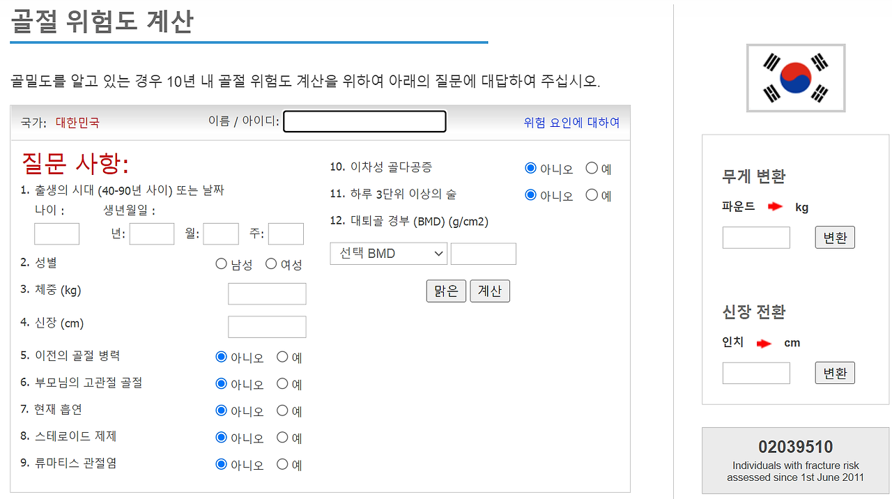 하지만 대부분 사람들은 병원 가기에 바쁘고 이에 골밀도를 측정받기가 어렵습니다. 또한 아무 증상이 없는데 검사비용을 내기도 부담스럽지요. 하지만 다행스럽게도 인터넷으로 무료로 간편하게 본인의 골절 위험도를 알 수 있습니다. 인터넷에 접속하여 검색창에 “골절위험도 예측 프로그램”이라고 검색하기만 하면 됩니다. 혹은 이 주소로 접속해서 들어갈 수도 있습니다다 www.sheffield.ac.uk/FRAX. 들어가면 가입 없이 간편하게 본인의 골절 위험도를 알아볼 수 있습니다. 상단에 한국을 선택하고 하단에 한국어로 선택하면 홈페이지의 영어도 다 한국어로 변환되어서 나옵니다. 골절위험성 예측 프로그램 (FRAX)은 국제적으로 공인된 측정 방법으로 세계 보건기구에서 개발된 알고리즘을 통해 40세 이상의 사람에게서 10년간 골다공증성 골절이 발생할 가능성이 얼마나 될지 알려줍니다. 나이, 키, 체중, 흡연, 3잔 이상의 음주 여부, 가족력 등 기본 정보만 입력하면 본인의 골밀도를 몰라도 결과를 보는데 지장이 없습니다. 홈페이지에 위험인자에 대해 자세하게 설명되어 있으니 기초지식이 없어도 쉽게 정보를 입력할 수 있습니다. 이렇게 현재까지의 연구된 데이터를 바탕으로 앞으로 뼈가 부러질 확률을 간편하게 계산해 줍니다. 그 결과 본인의 골절위험도를 계산해보았는데 만약 골다공증성 골절 발생 위험률이 20퍼센트를 넘거나 고관절 골절 발생 위험률이 3퍼센트 이상으로 결과가 나오면 골다공증의 가능성이 높으므로 반드시 병원에 내원하여 상담을 받는 것이 좋습니다.