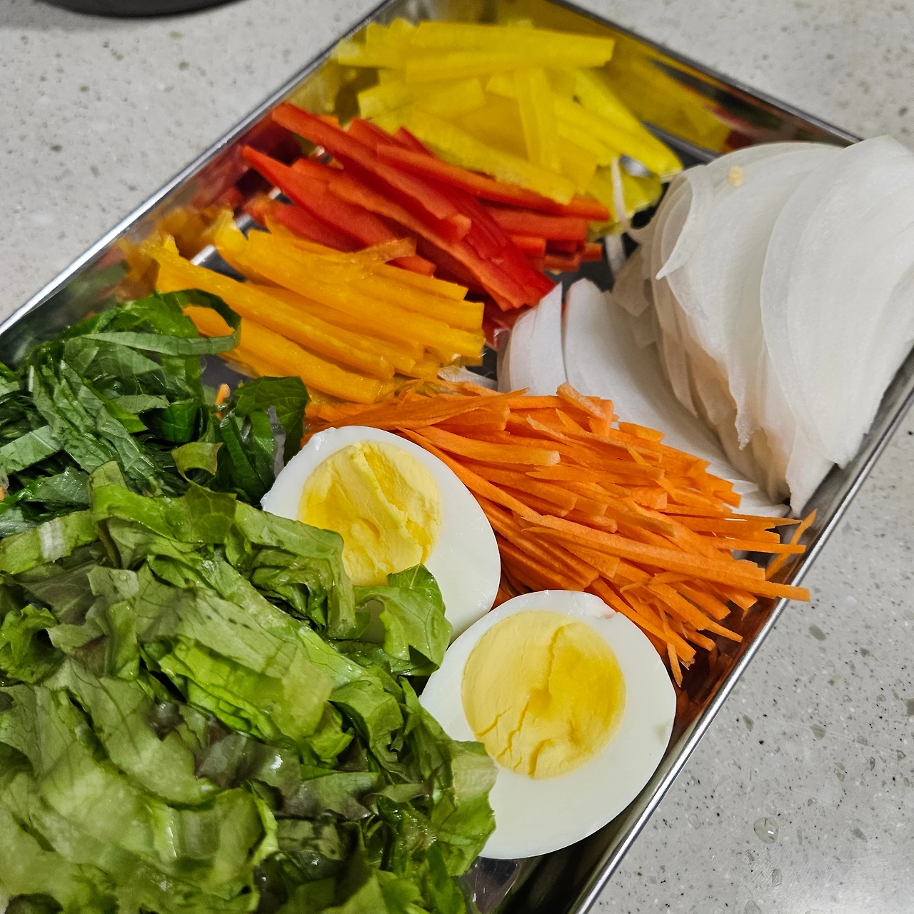 마침내 완성되었다. 족발만으로는 아쉬우니 국수도 삶아야지. 올해 비빔국수를 해 먹으려고 만들어둔 양념장도 마침 냉장고에 있어 얼른 쟁반국수도 만들었다. 무도 채 썰어 수분 빼고 꼬들꼬들하게 무쳤다.