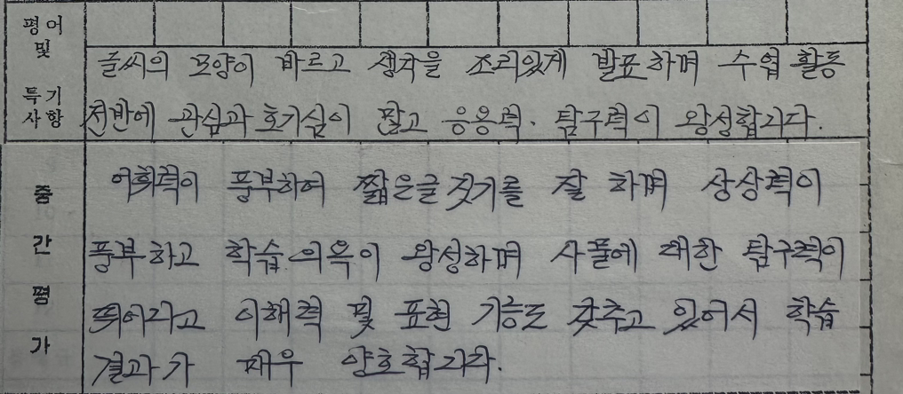 “우리 뿌듯이는 항상 밝고 명랑한 어린이 입니다. 하지만 나보다 못한 친구들에 대한 배려가 있다면 훨씬 더 훌륭한 아이로 성장할 것입니다.” ㅎㅎㅎ 선생님들의 통찰력이란!