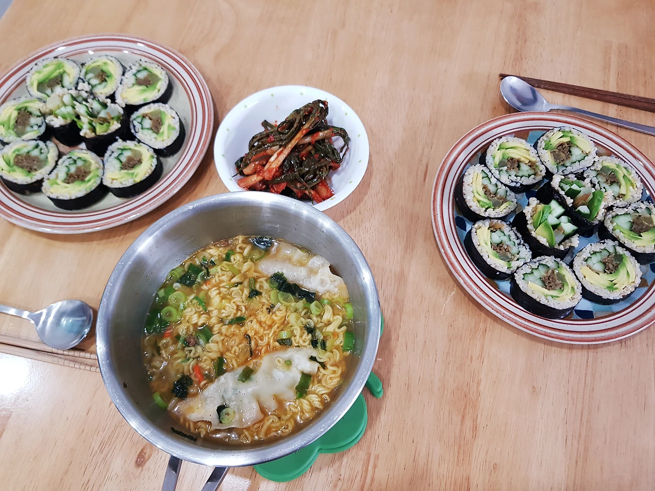 이 소중한 금요일에 김밥만 먹기엔 밋밋해서 라면을 한 개 끓였다. 거기에 만두 두 개를 넣어 우리는 김밥 두 줄과 만두 두 개, 라면 한 개로 사이좋게 저녁 식사를 했다.