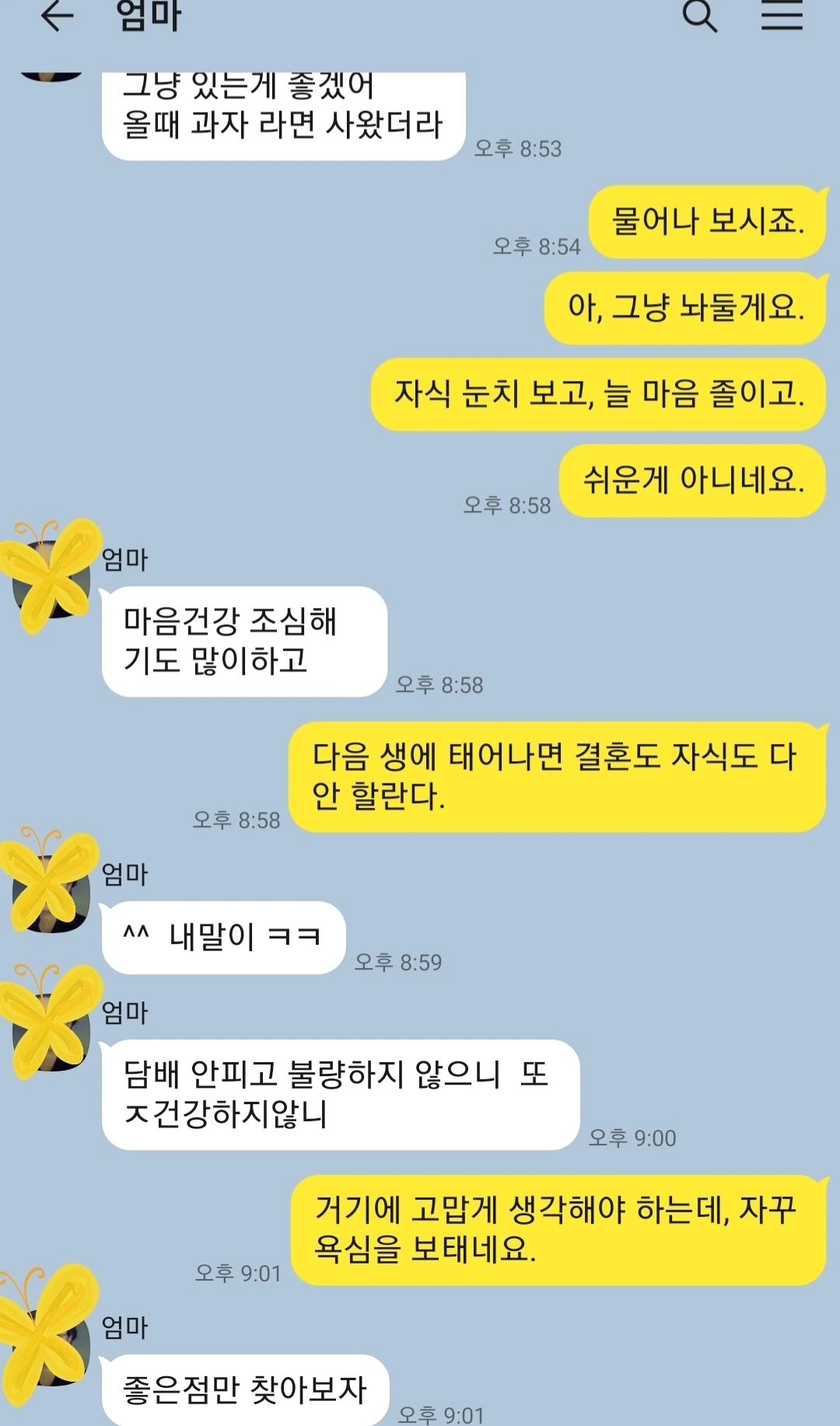 아직 나는 K가 유치원 다닐 때, 초등학교 저학년 때 주었던 짧은 편지를 곱게 접어 지갑에 넣어 가지고 다닌다. 업무 보면서 속상한 일이 있을 때 가끔 그 편지를 펼쳐 보면 어느새 내 머릿속은 백지가 되어 버리는 마법도 경험해 봤다. 편지를 전해 줄 때 아이가 수줍어하며 도망가던 모습, 편지를 주면서 안아주던 모습이 아직 너무 선하다. 뱃속에 품고 있을 땐 '건강하고 심성 바른 아이를 주셔서 감사합니다.'하고 늘 기도했는데, 그 간절한 기도를 하늘이 아시고는 이미 내게 다 주셨음에도 나는 다 까먹고 더 달라고, 더 내놔라고 간절함도 없이 당연하게 요구하고 있다. 게다가 첫째, 둘째, 셋째 요구사항을 곰곰이 생각해보니 난 분명 엄마라는 타이틀에 맞는 책임감으로 행했던 액션이었지만 내 생각과는 전혀 다른 방향으로 받아들였던 아이를 이해할 수 있을 것 같았다. 엄마로서의 책임감이라기보다는 내 만족에 더 가깝다고 봐야 할 것이다. 그래도 친정이 가까우니 이럴 땐 좋다. 아이가 외가를 휴식처로 찾을 수 있으니 말이다. 출산휴가를 끝내고 복직하면서 친정어머니와 시어머니께서 K를 정말 정성스럽게 봐주셔서 인지 "요즘 애"답지 않게 양가 할머니에 대한 애정이 넘친다. 친정어머니께서 톡을 주신다. 오늘 K가 좋아하는 소고기를 구워 줄 예정이고, 할머니한테는 목소리가 밝다고. 다행이다. 엄마인 나한테만 퉁명스러운 거면.