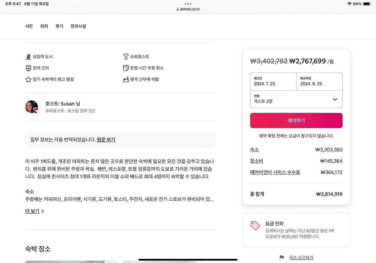 한달 이상 머무는 기간이라 특별할인을 요청했는데 많이 깍아주기는 힘들다는 답변을 받았다. 그런데 만약 시티 센터안에 머물거면 에어비앤비 대신 아파트형 호텔을 찾아보자.