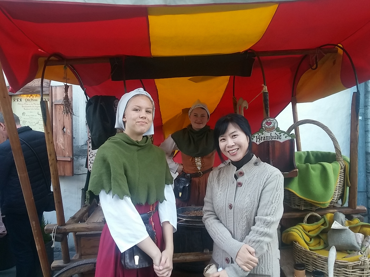 두 봉지를 사 들고 에스토니아의 전통옷을 입은 아가씨와 사진을 찍을 수 있는지 물으니 선뜻 응해준다.