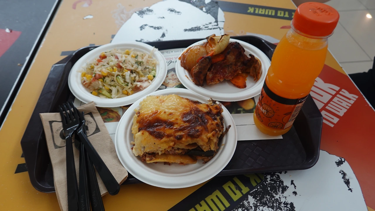 우리는 점심식사로 소고기 라자냐와 닭고기구이, 그리고 양배추 샐러드와 주스를 주문했는데 단지 15레바(한화 12,000원)로 배불리 먹을 수 있다는 것에 무척 기분이 좋다.