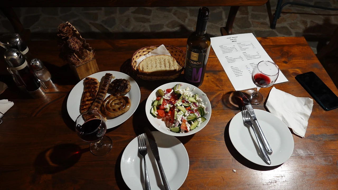 불가리아 와인과 샵스카 샐러드, 미트볼, 케바체...